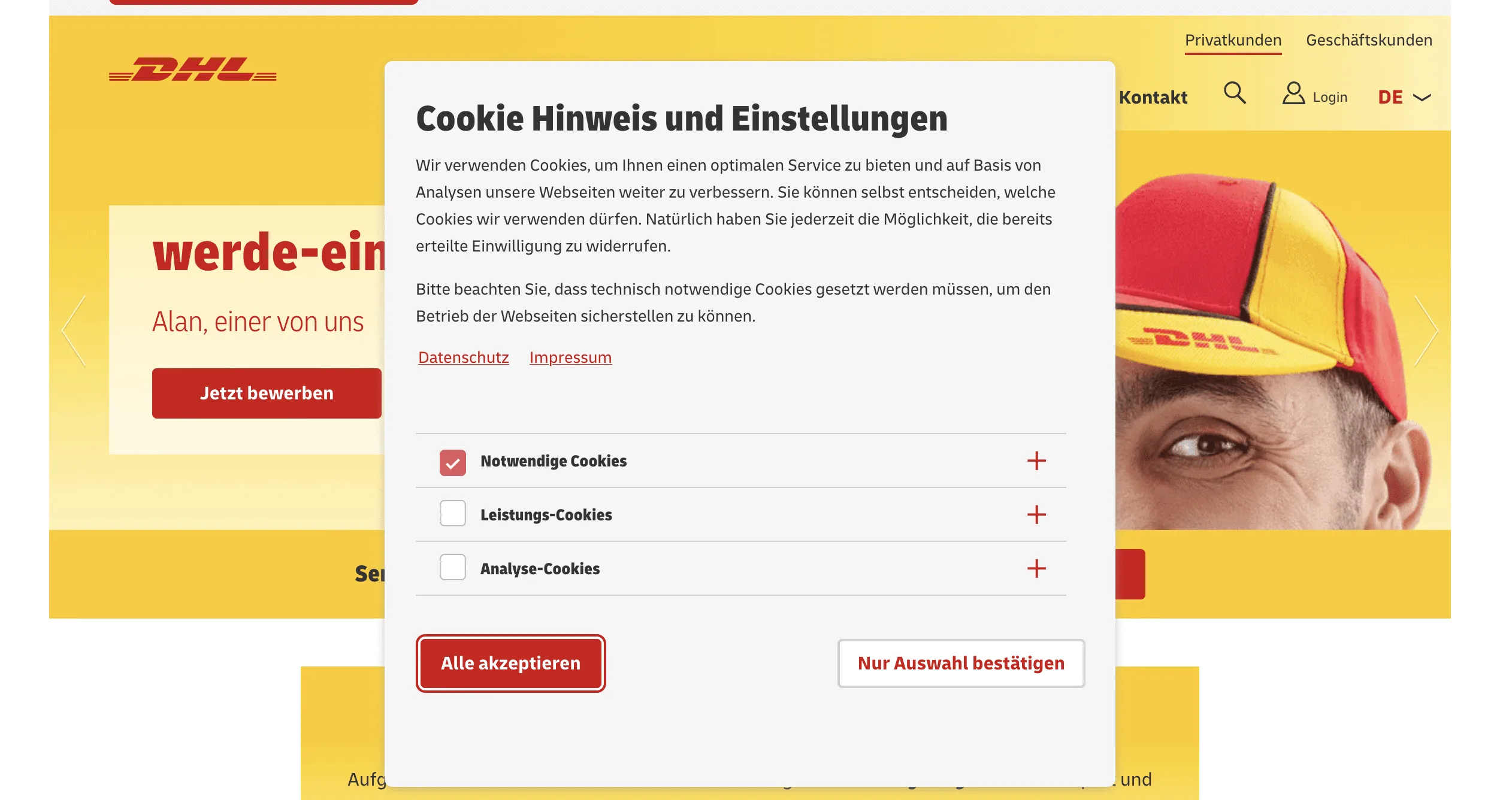 This example explains why cookies are set in the first place. Furthermore, the classification into the individual cookie groups is directly visible – without the user having to click through the banner several times. No reject button is presumably allowed here, because by default all groups that are not necessary can be selected and deactivated. The user can therefore simply decline via the “Confirm selection only” (“Nur Auswahl bestätigen”) button. The only thing that is noticeable in this example is that in the details of the third-party cookies, it is not specified which provider sets the cookies and its privacy policy is missing. Apart from that, only the reference to the protection of minors is missing.
