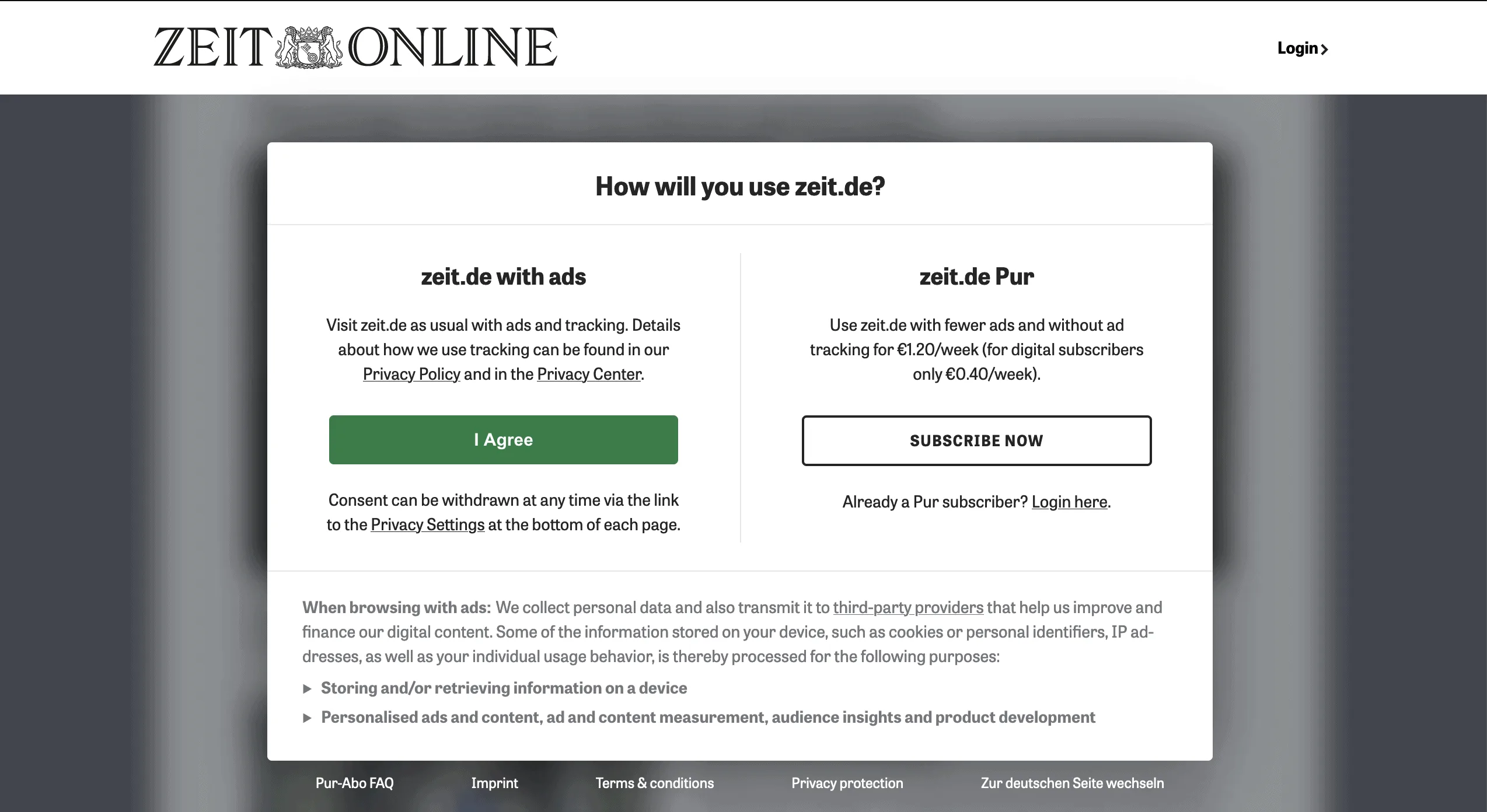 You can’t get past this cookie banner until you either give your consent or sign up for a monthly subscription. You will often find this type of cookie notice on online newspapers because they are sometimes financed by advertising revenue. Normally, you can’t force the user to agree, but in this case you can. According to the EDSA, such a “cookie wall” may be used. Such portals are financed by advertising revenue in order to guarantee high-quality journalistic work – which should be worth a quick click on “Accept all” 🙂