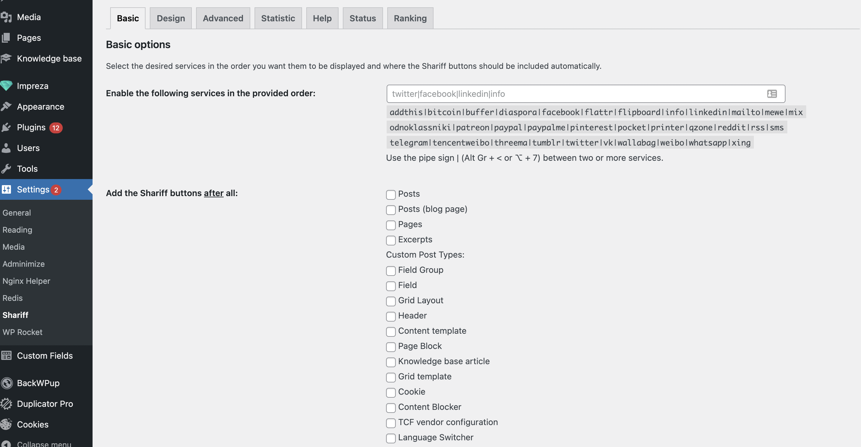 After installation, the plugin is ready to go. You will find it in the list of your plugins (who would have thought it 😉 ) or under Settings > Shariff. You will be shown the various tabs (e.g. Basic, Design and Statistics) with which you can optimise your settings.
