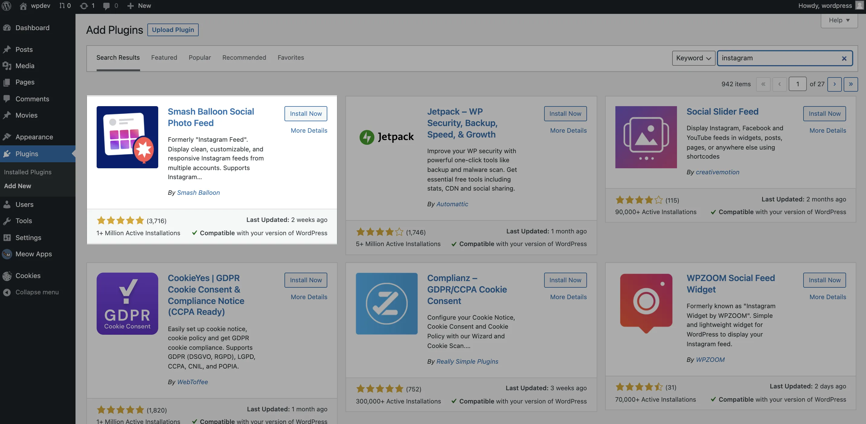 - Gehe links im Menü zu Plugins > Installieren. Suche nach dem Plugin Smash Ballon Social Photo Feed. Theoretisch reicht es auch, wenn du einfach nach "Instagram" suchst. Das Plugin erscheint in der Regel als Erstes, da es ehemals unter dem Namen "Instagram Feed" bekannt wurde.