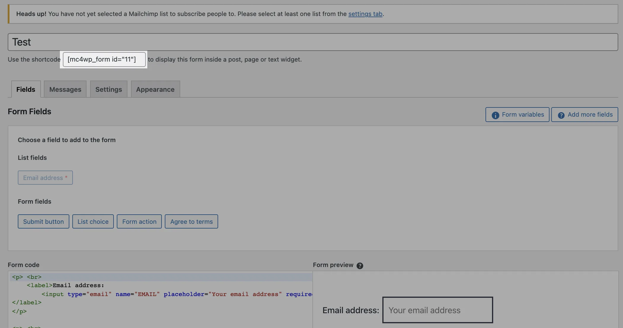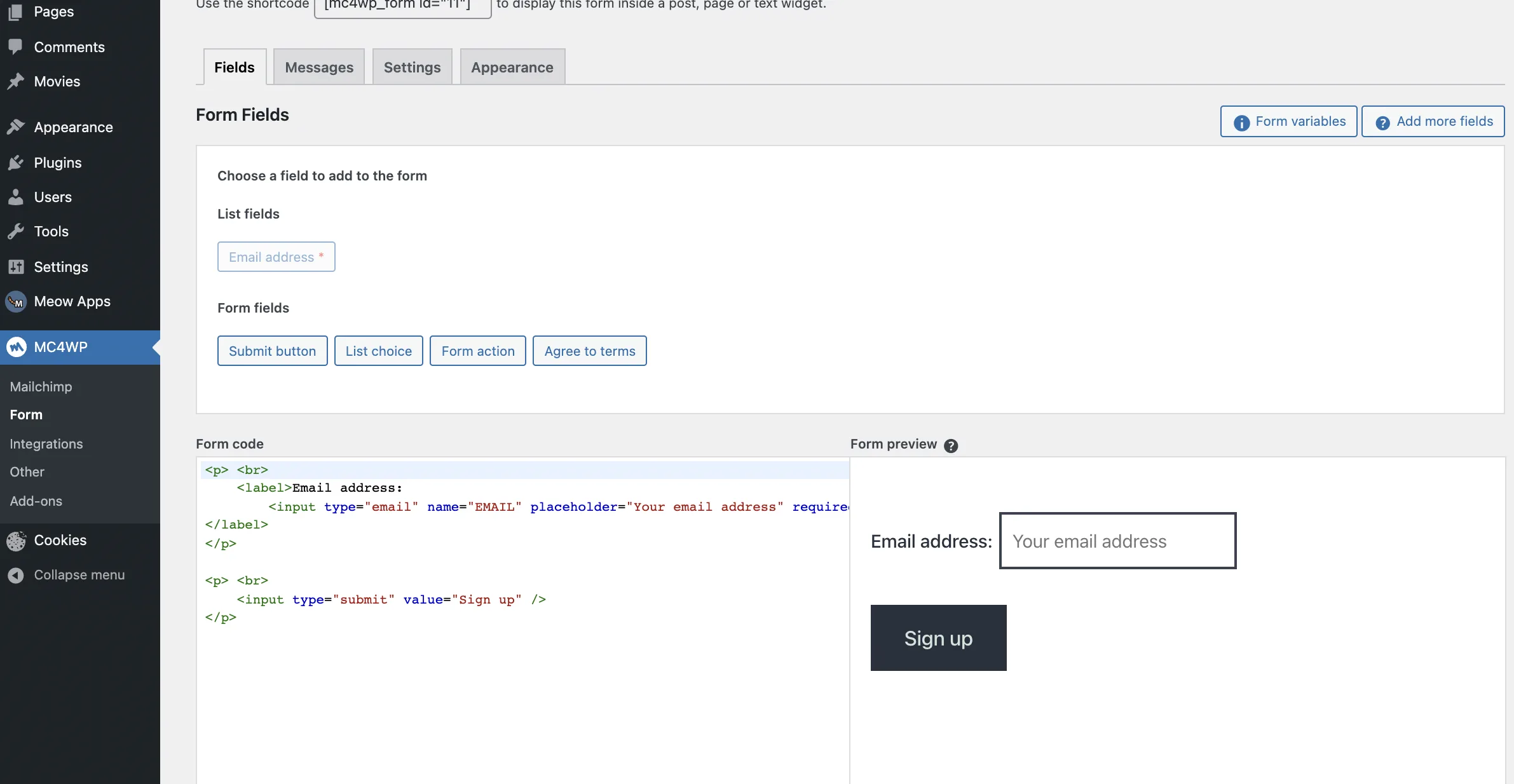 - Klicke jetzt links im Menü auf MC4WP > Formular.