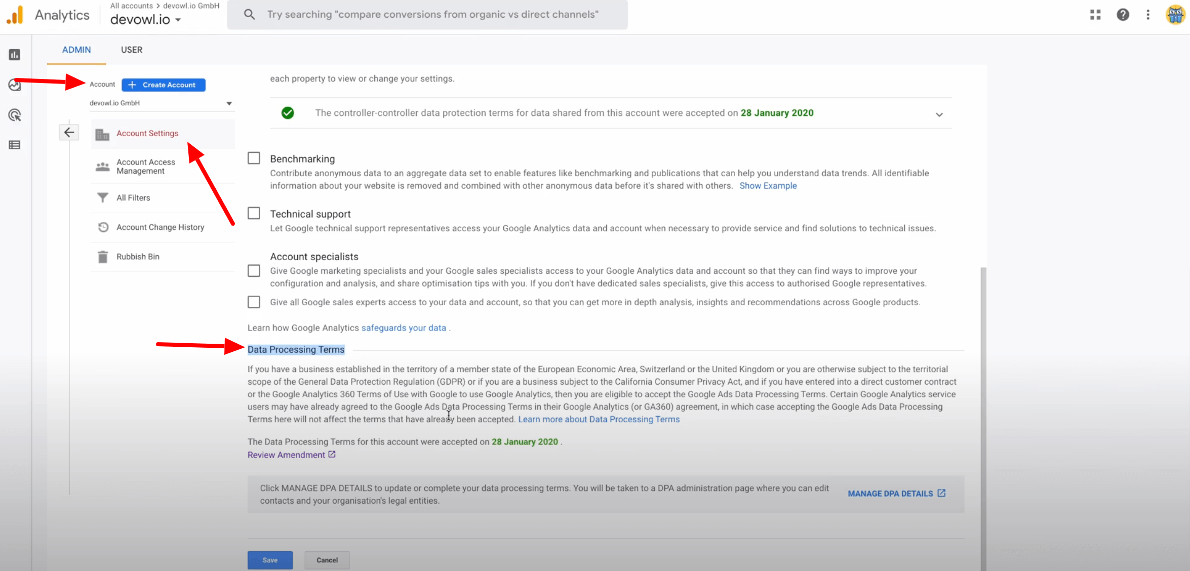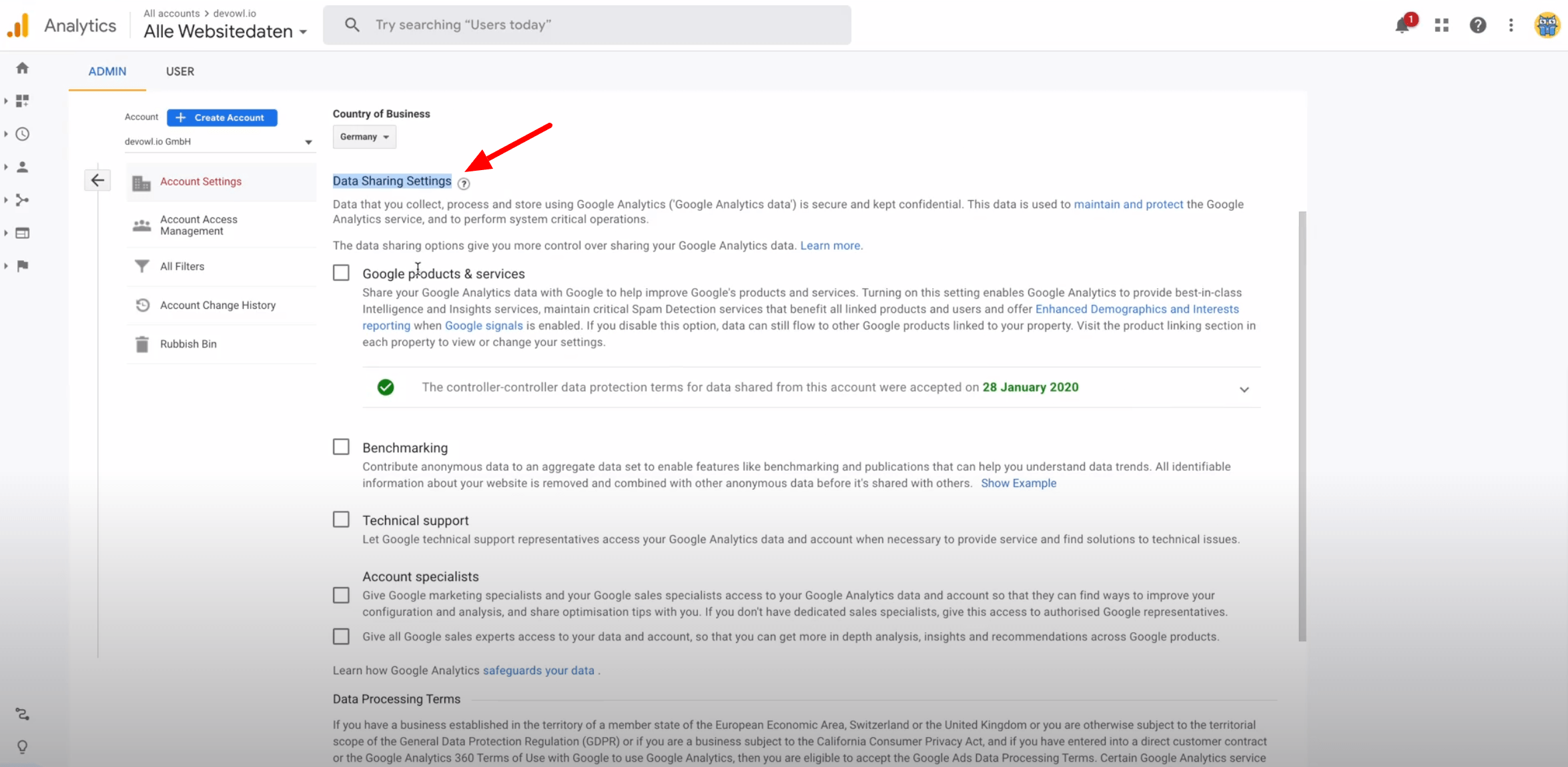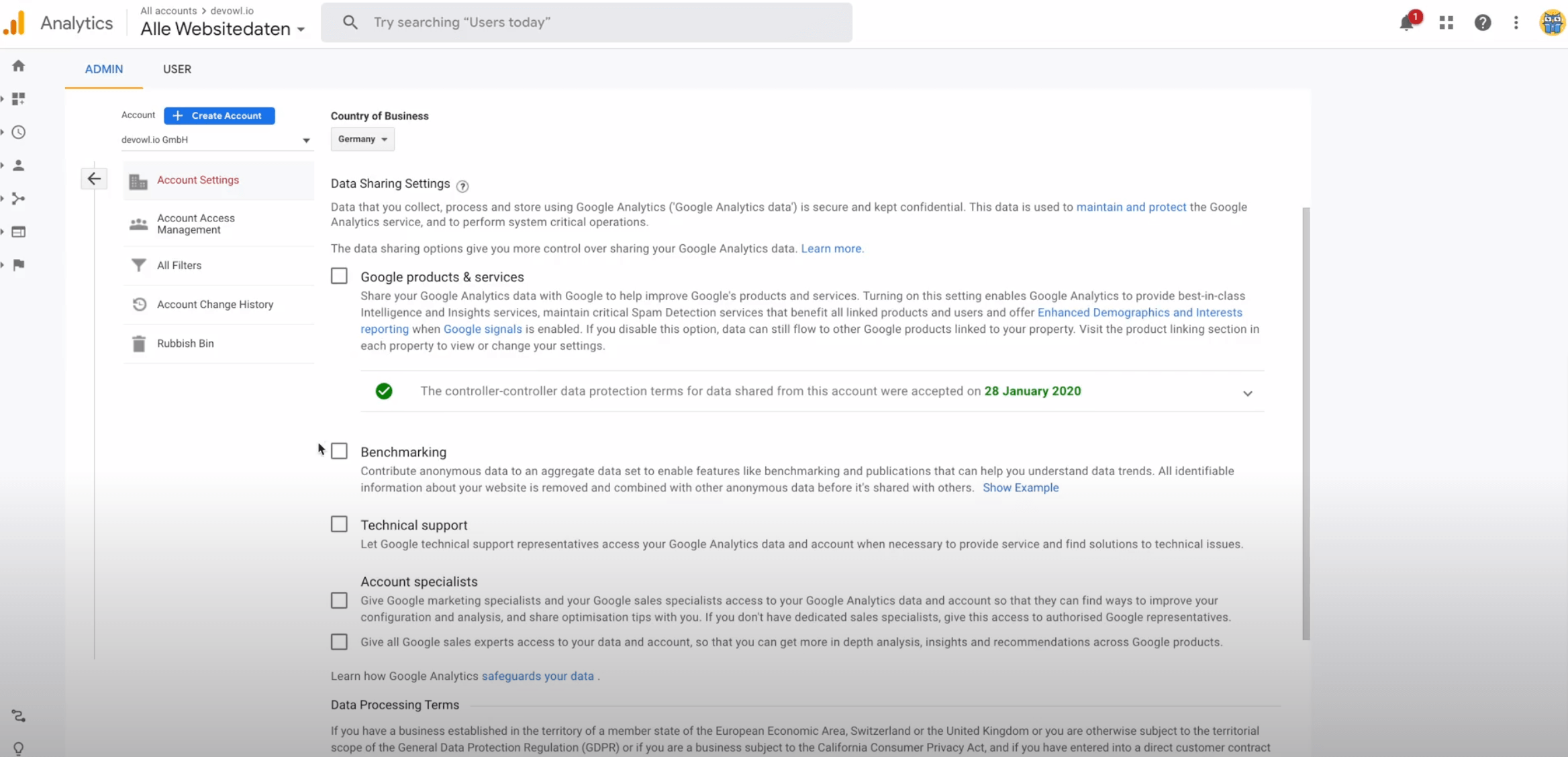 Zum einen kannst du auf Account-Ebene manuell einstellen, welche Daten du mit Google teilen möchtest, die du über Google Analytics sammelst.