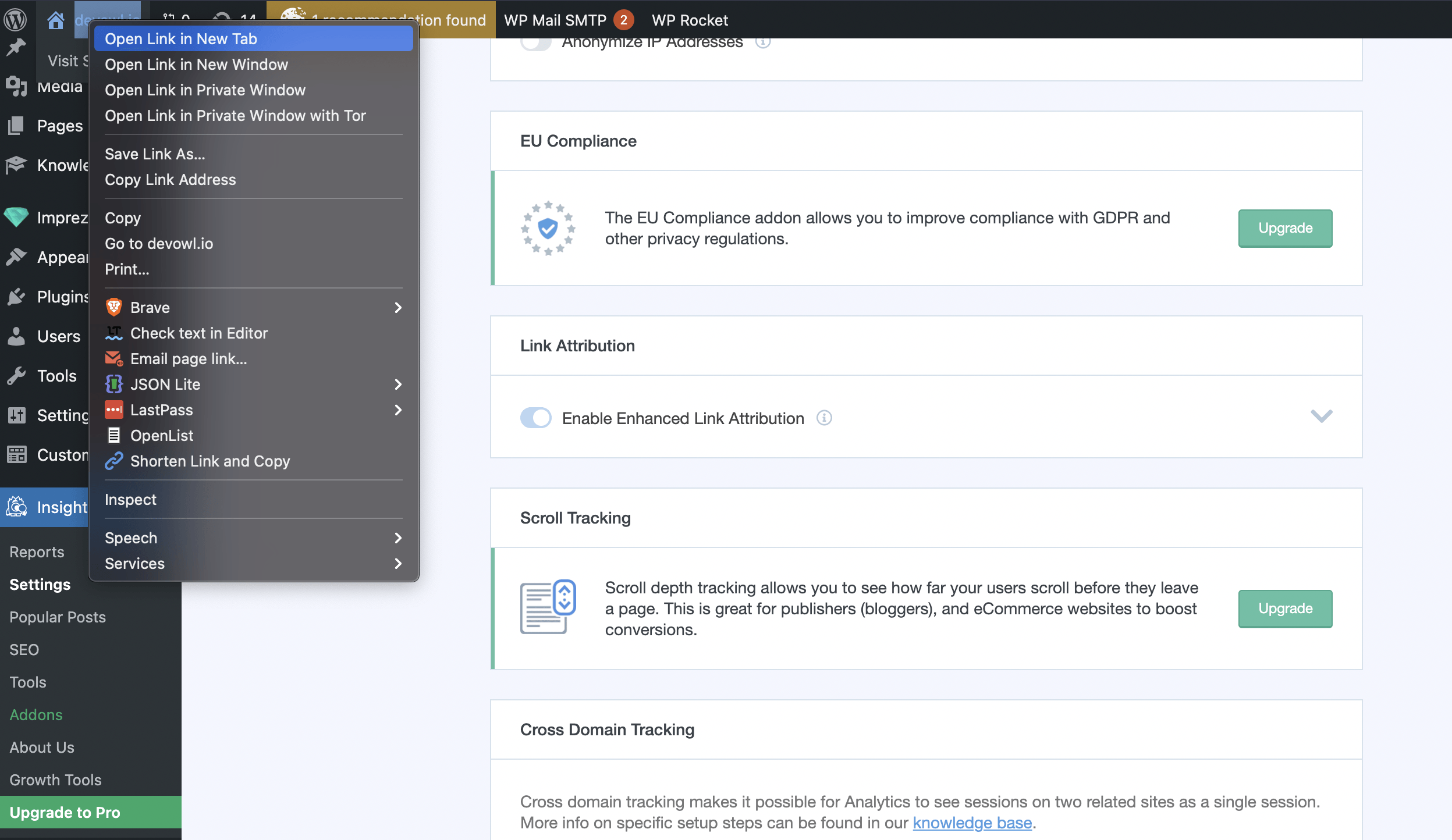 - Nach der Ersteinrichtung (Keine Panik, MonsterInsights ist dank einer geführten Konfiguration super easy einzurichten), gehst du zu den Einstellungen des Plugins. Hierzu klickst du in der linken Menüleiste auf Insights > Settings.
