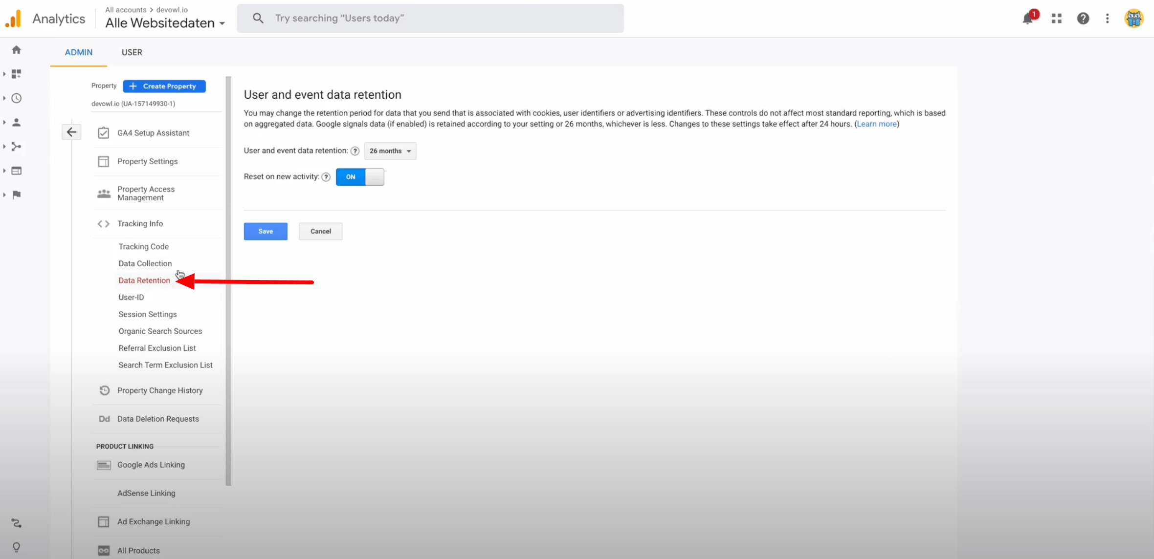 - Wähle in der zweiten Spalte deine Property aus und gehe zu Tracking-Informationen > Datenaufbewahrung.