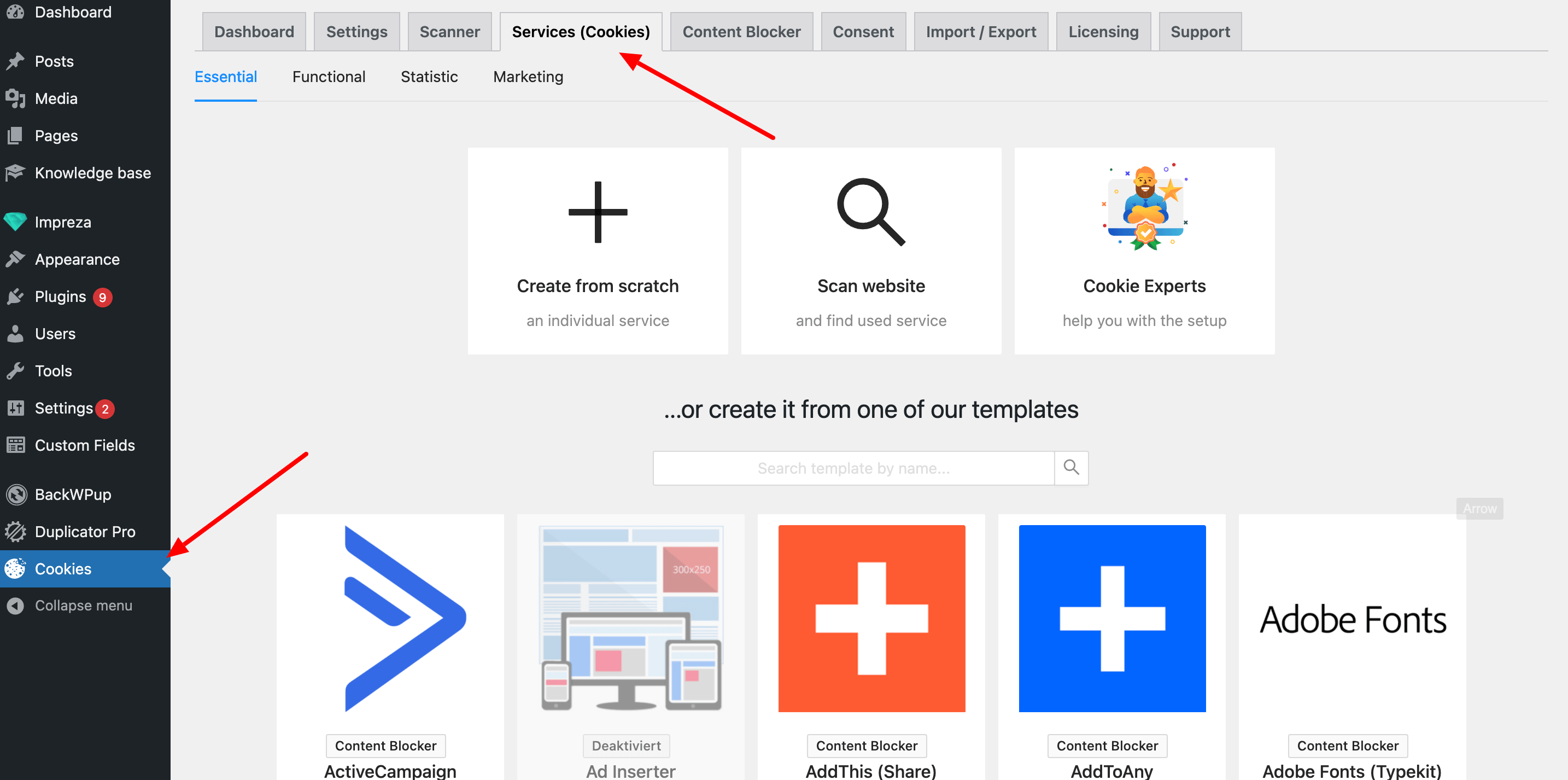 - Dir wird nun eine Ansicht angezeigt, in der du dein Cookie Banner konfigurieren kannst. Im oberen Menü wird dir der Reiter Services (Cookies) angezeigt. Klicke auf diesen.