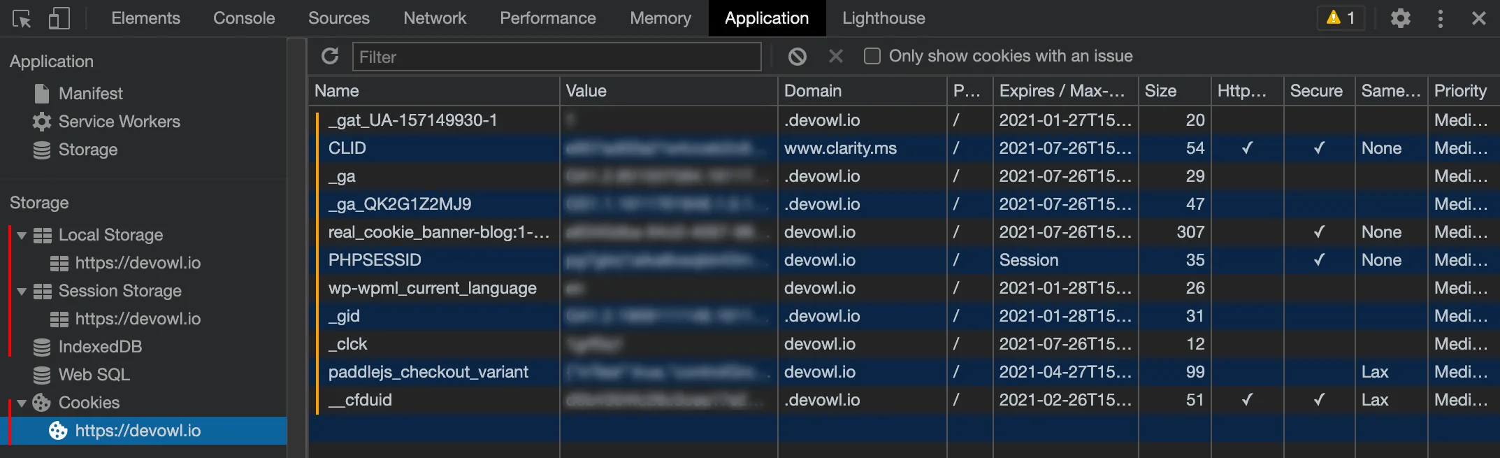 Wie im vorherigen Abschnitt musst du deine Webseite in Google Chrome oder einem Chromium Browser öffnen. Klicke dann mit der rechten Maustaste irgendwo auf deine Webseite, um das Kontextmenü zu öffnen, wo du Untersuchen auswählen kannst. Es öffnet sich eine neue Leiste in deinem Browser mit mehreren Tabs. Diesmal wählst du den Tab Application. Wir interessieren uns wieder für die linke Spalte und vor allem für den Bereich Storage. In diesem Abschnitt solltest du jeden Eintrag aufklappen, der Untereinträge hat, die durch ein Dreieck markiert sind. Dann kannst du jeden Eintrag durchgehen. Du musst nicht nur für (HTTP) Cookies (Services) zustimmen, sondern auch für das Setzen von nicht essenziellen Service-ähnlichen Daten wie im Local Storage, Session Storage und der IndexedDB. In der großen zweiten Spalte kannst du sehen, welche Services oder Service-ähnlichen Informationen gespeichert werden.