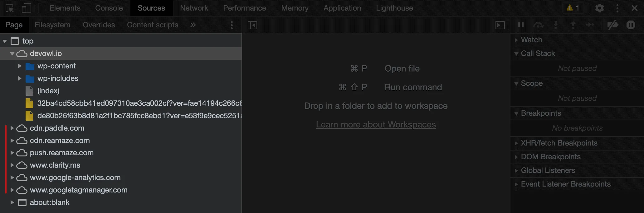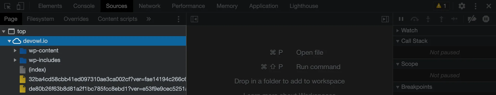 Öffne in Google Chrome oder einem Chromium Browser deine Webseite. Klicke dann mit der rechten Maustaste irgendwo auf deine Webseite, um das Kontextmenü zu öffnen, wo du Untersuchen auswählst. Es öffnet sich eine neue Leiste in deinem Browser mit mehreren Tabs. Du wählst den Reiter Sources aus. Du siehst nun ein dreispaltiges Layout, wobei uns die linke Spalte interessiert. In dieser Spalte kannst du sehen, welche Dateien von welchen Domains (Services) geladen wurden, als du diese spezielle Unterseite deiner Website aufgerufen hast.
