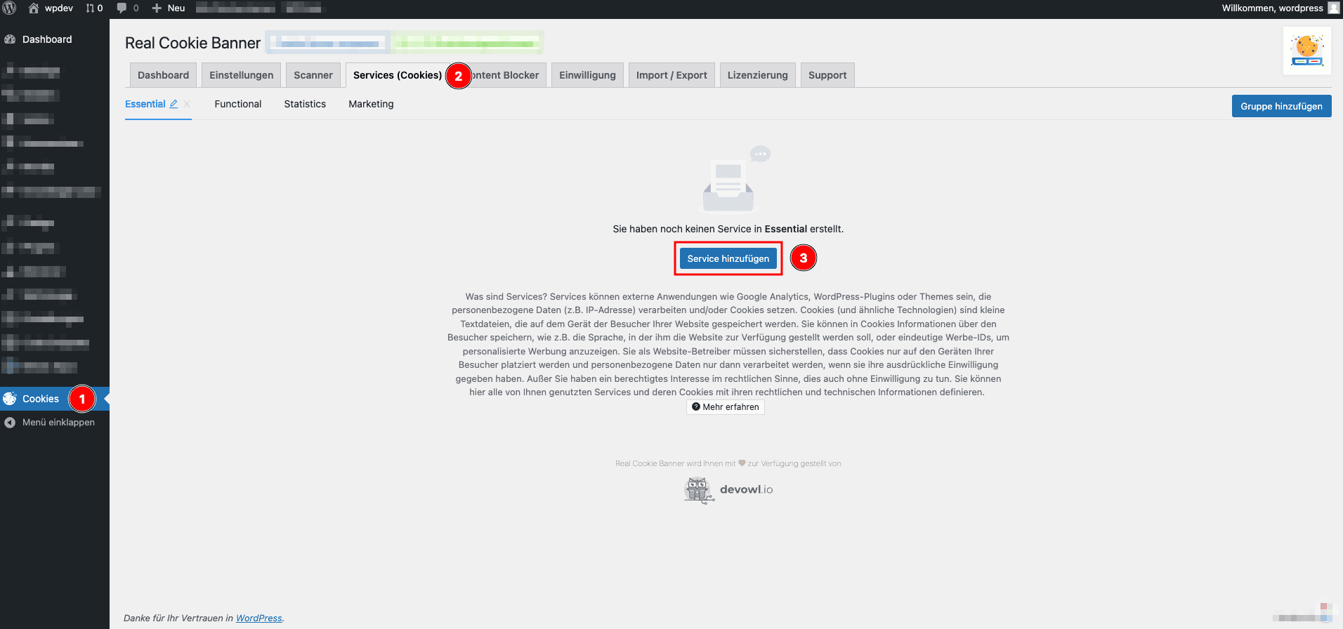 1. Navigiere in deinem WordPress-Backend zu Cookies > Services (Cookies) und klicke auf "Service hinzufügen", um den Service zu erstellen.