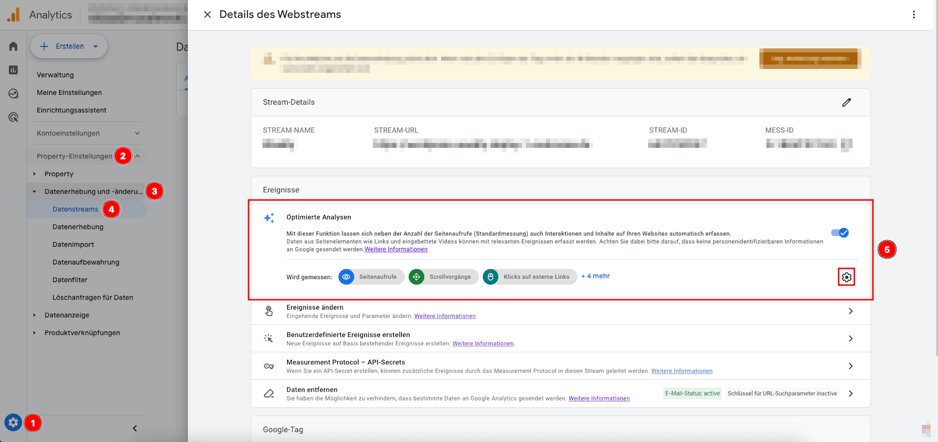 📍Verwaltung (Zahnrad) > Property-Einstellungen > Datenerhebung und -änderung > Datenstreams > Details des Webstreams [Name des Streams] > Ereignisse > Optimierte Analysen > [alle Optionen]