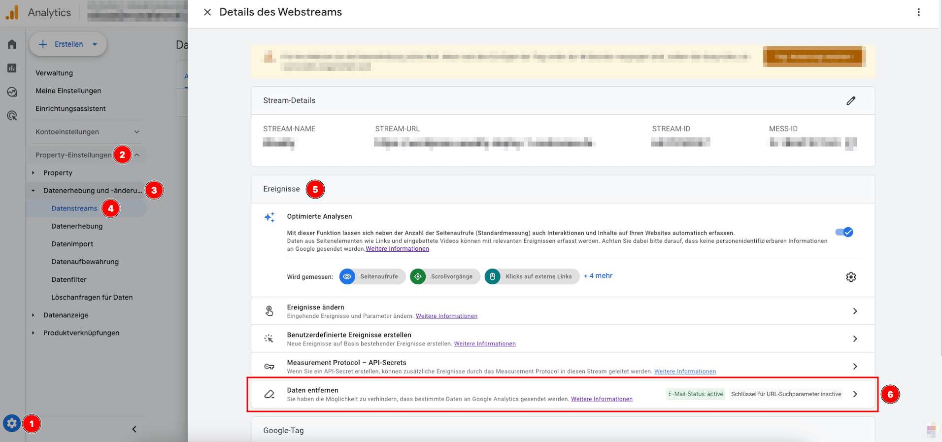 📍Verwaltung (Zahnrad) > Property-Einstellungen > Datenerhebung und -änderung > Datenstreams > Details des Webstreams [Name des Streams] > Ereignisse > Daten entfernen