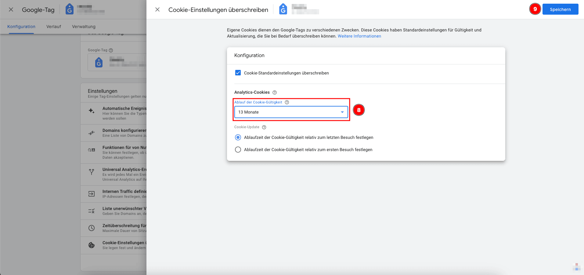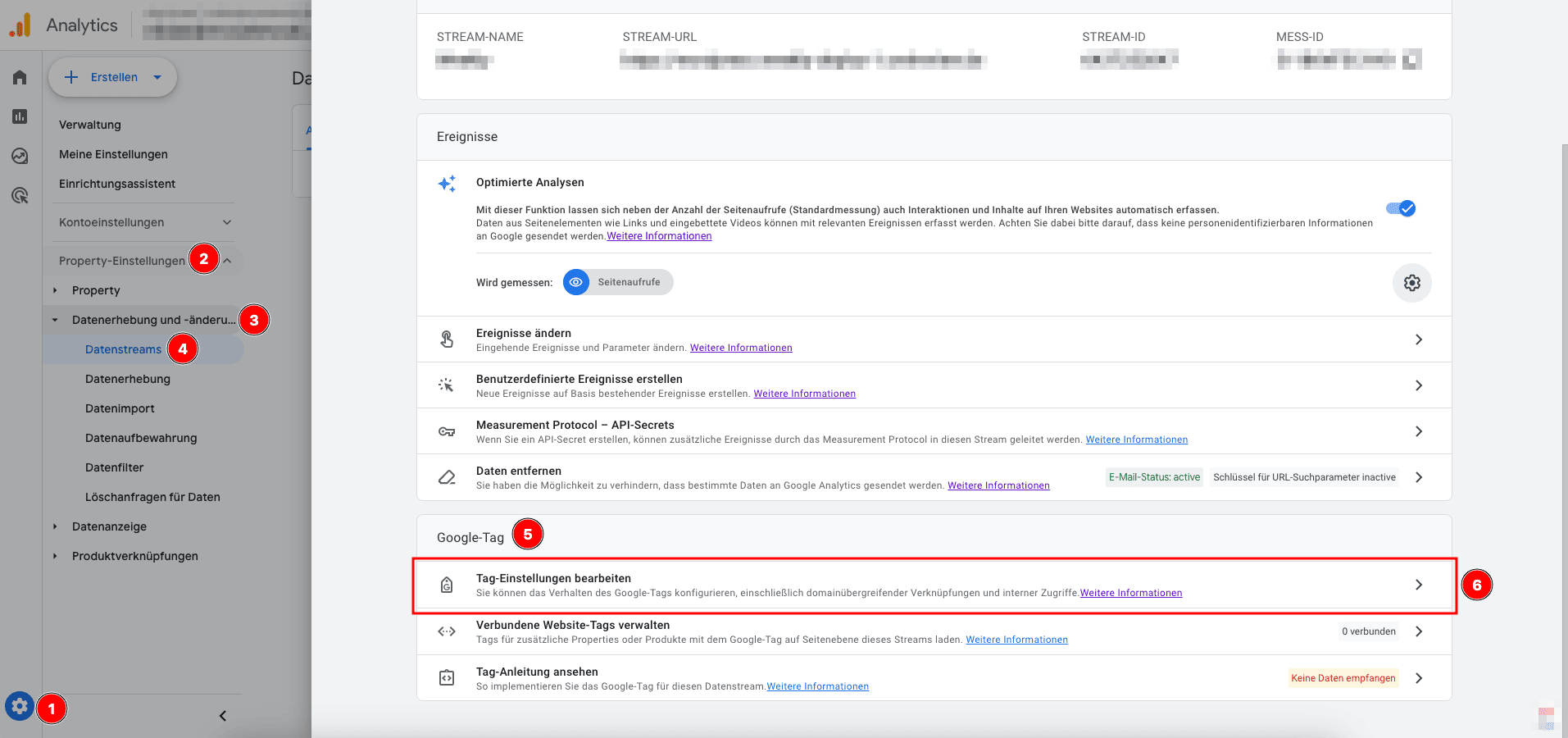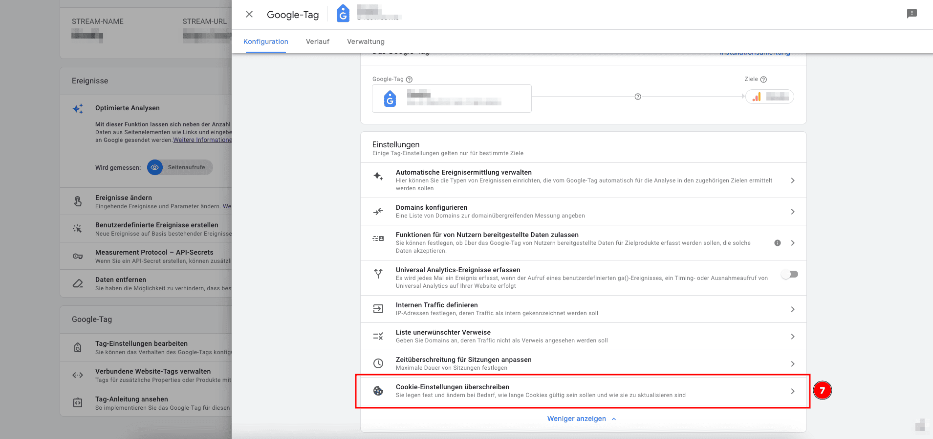 📍Verwaltung (Zahnrad) > Property-Einstellungen > Datenerhebung und -änderungen > Datenstreams > Details des Webstreams > Google-Tag > Tag-Einstellungen konfigurieren > [Mehr anzeigen] > Cookie-Einstellungen überschreiben