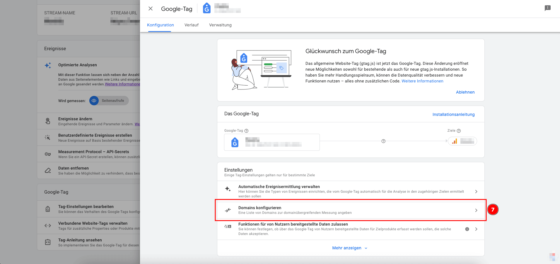 📍Verwaltung (Zahnrad) > Property-Einstellungen > Datenerhebung und -änderungen > Datenstreams > Details des Webstreams > Google-Tag > Tag-Einstellungen bearbeiten > Domains konfigurieren > Domainübergreifende Verknüpfungen konfigurieren