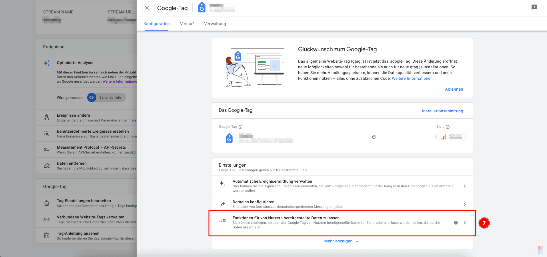 📍Verwaltung (Zahnrad) > Property-Einstellungen > Datenerhebung und -änderungen > Datenstreams > Details des Webstreams > Google-Tag > Tag-Einstellungen konfigurieren > Funktionen für von Nutzern bereitgestellte Daten zulassen