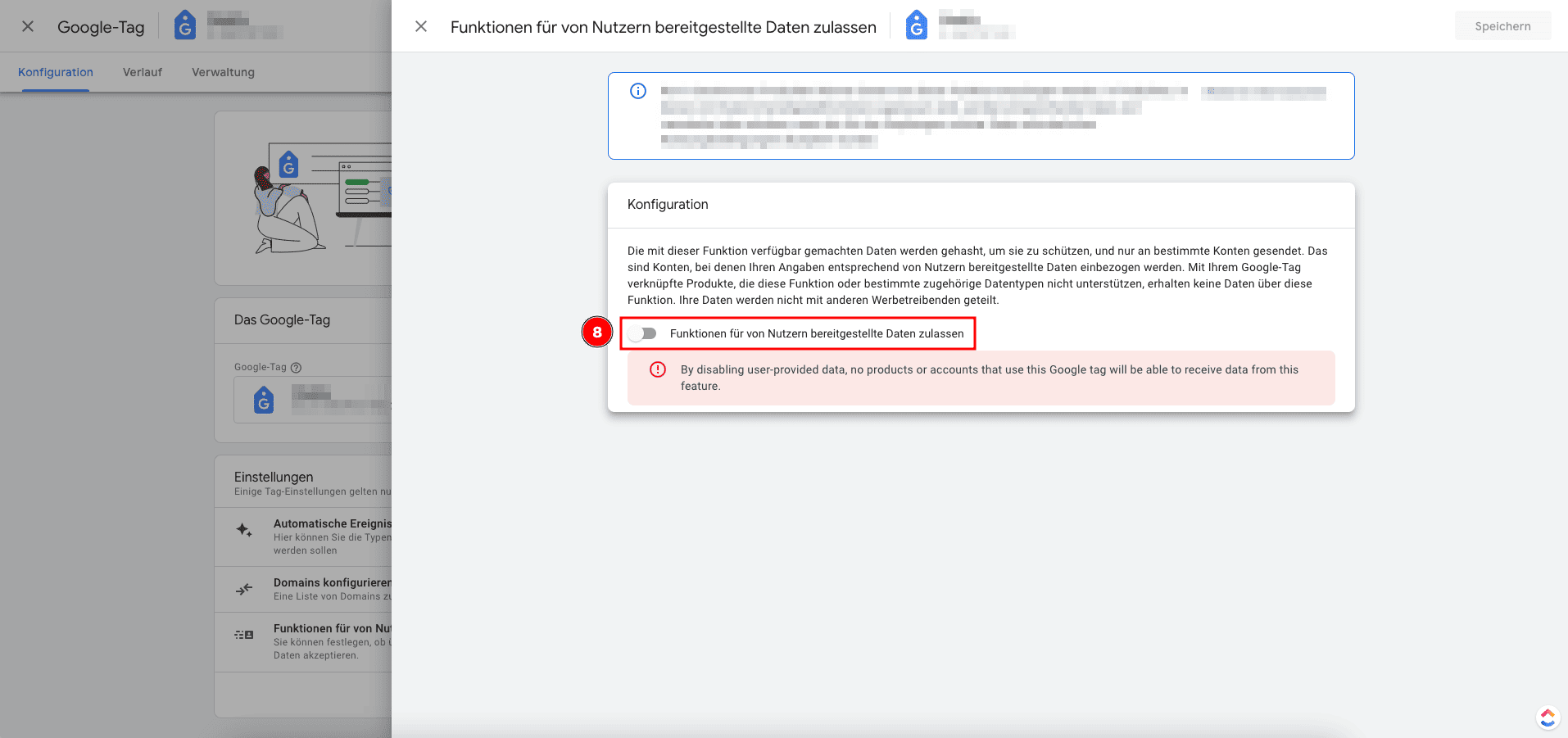 Du kannst einstellen, wie du mit Daten von Nutzern umgehst, die im Browser mit ihrem Google Account angemeldet sind. Dies ist für dich nur relevant, wenn du Google Ads oder andere Werbeplattformen von Google verwendest, also Werbung über Google schaltest. Google gibt hier in den Einstellungen an, dass die damit verbundenen Daten gehasht werden, um sie zu schützen, und nur an die Google-Konten gesendet werden, die solch einer Nutzung zugestimmt haben. Wir empfehlen dir daher den voreingestellten Haken bei "Funktionen für von Nutzern bereitgestellte Daten zulassen” zu entfernen, wenn du keine Werbebuchungen vornimmst und somit seinen Zweck nicht erfüllt wird.