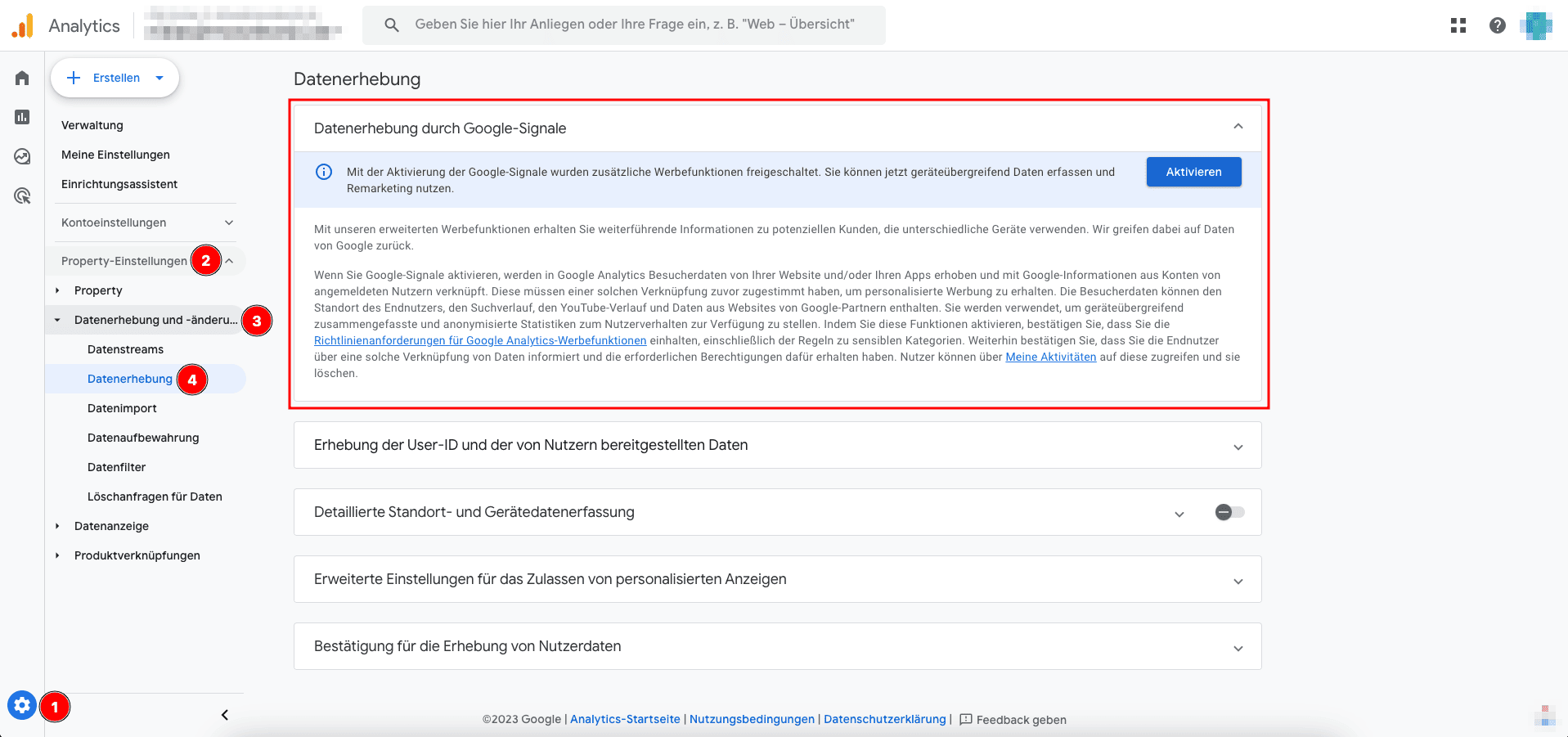 📍📍Verwaltung (Zahnrad) > Property-Einstellungen > Property > Datenerhebung und -änderungen > Datenerhebung > Datenerhebung durch Google-Signale