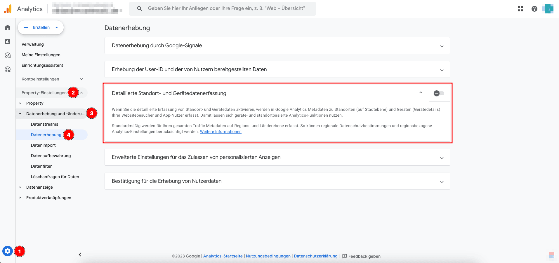 📍Verwaltung (Zahnrad) > Property-Einstellungen > Datenerhebung und -änderungen > Datenerhebung > Detaillierte Standort- und Gerätedatenerfassung