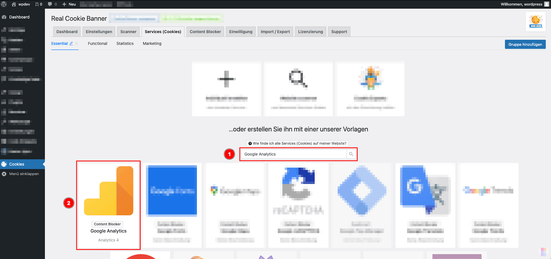 Wenn du Real Cookie Banner in deinem WordPress installiert hast, kannst du Google Analytics ganz einfach mit Hilfe unserer vorgefertigten Service-Vorlage (in der PRO-Version erhältlich) integrieren.