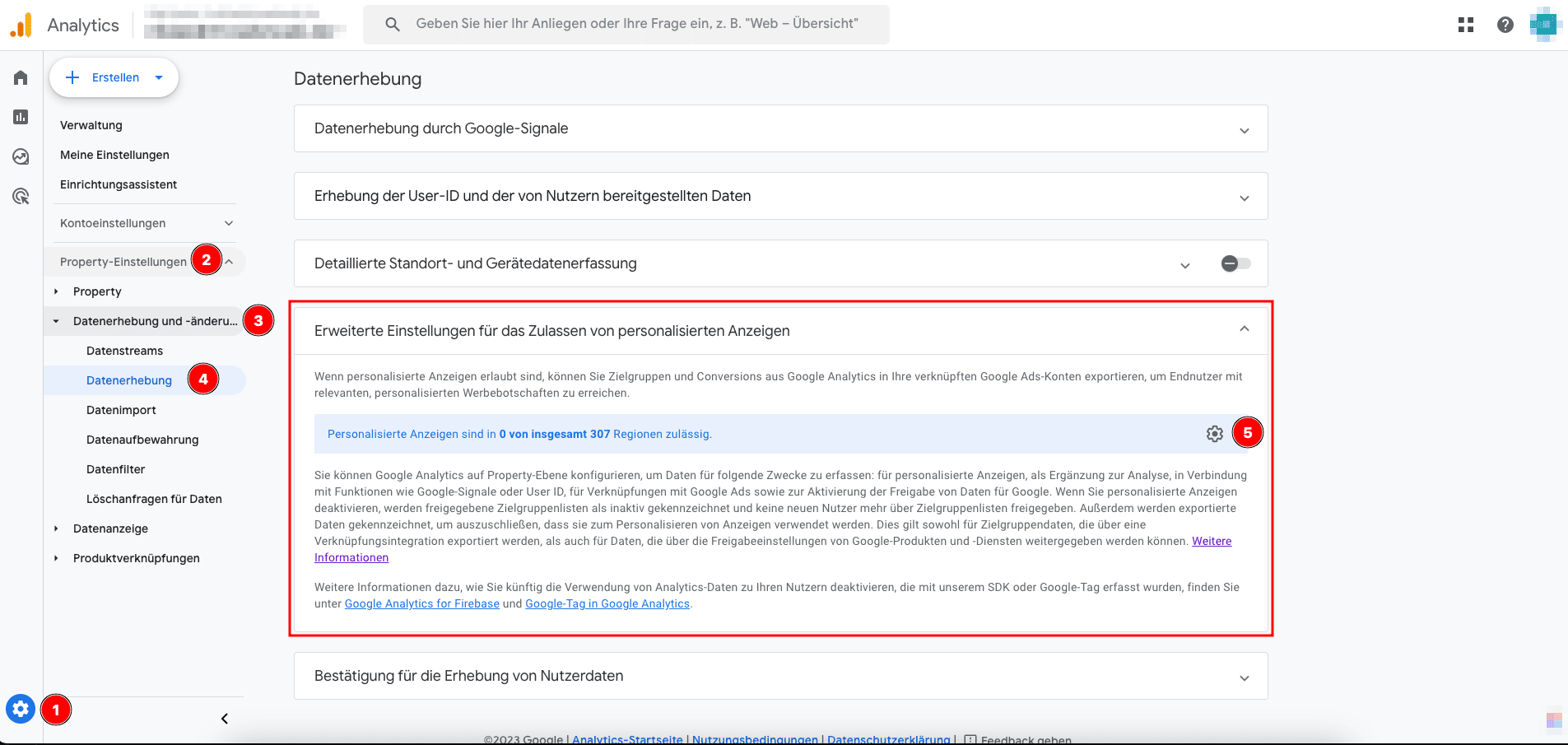 📍Verwaltung (Zahnrad) > Property-Einstellungen > Datenerhebung und -änderungen > Datenerhebung > Erweiterte Einstellungen für das Zulassen von personalisierten Anzeigen