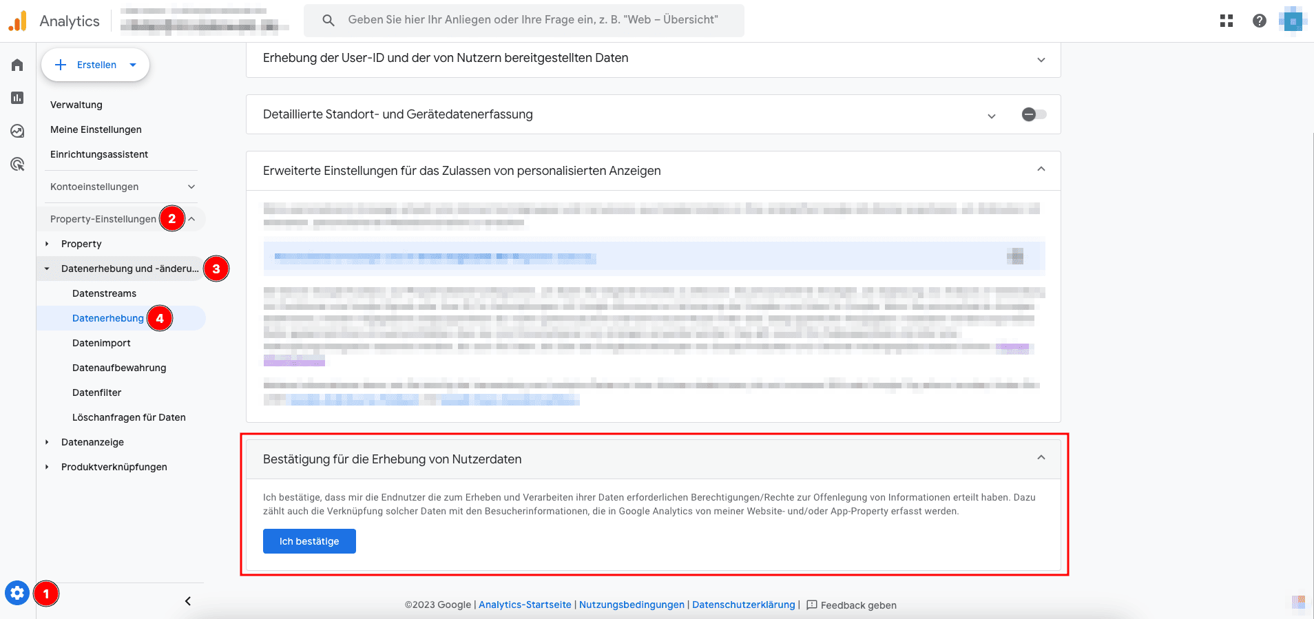 📍Verwaltung (Zahnrad) > Property-Einstellungen > Datenerhebung und -änderungen > Datenerhebung > Bestätigung für die Erhebung von Nutzerdaten