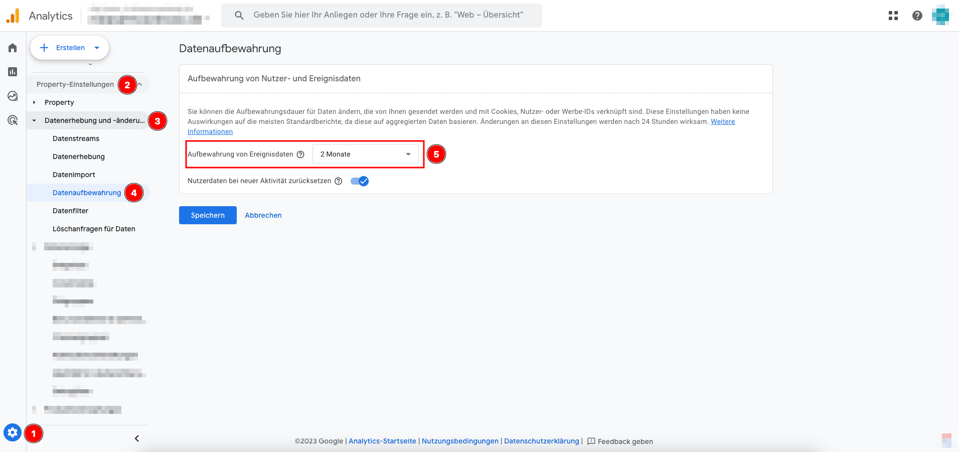 📍Verwaltung (Zahnrad) > Property-Einstellungen > Datenerhebung und -änderungen > Datenaufbewahrung > Aufbewahrung von Nutzer- und Ereignisdaten