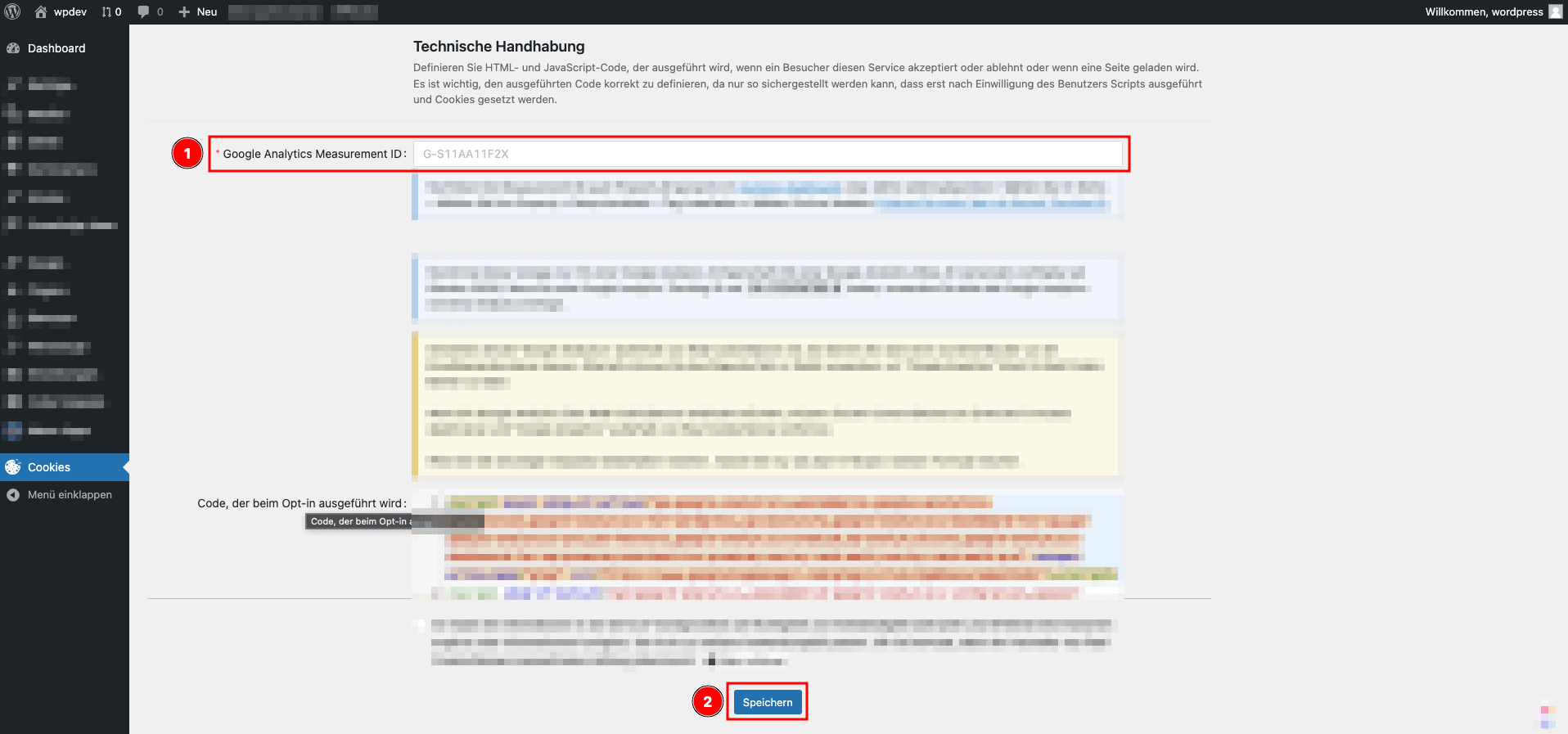 Gib deine "Google Analytics Measurement ID" in den Dienst ein. Du findest deine Measurement ID im Analytics Dashboard unter Verwaltung (Zahnrad) > Property-Einstellungen > Datenerhebung und -änderung > Datenstreams > [Wähle deinen Steam] > Drücke das "Kopieren"-Icon bei Measurement ID.