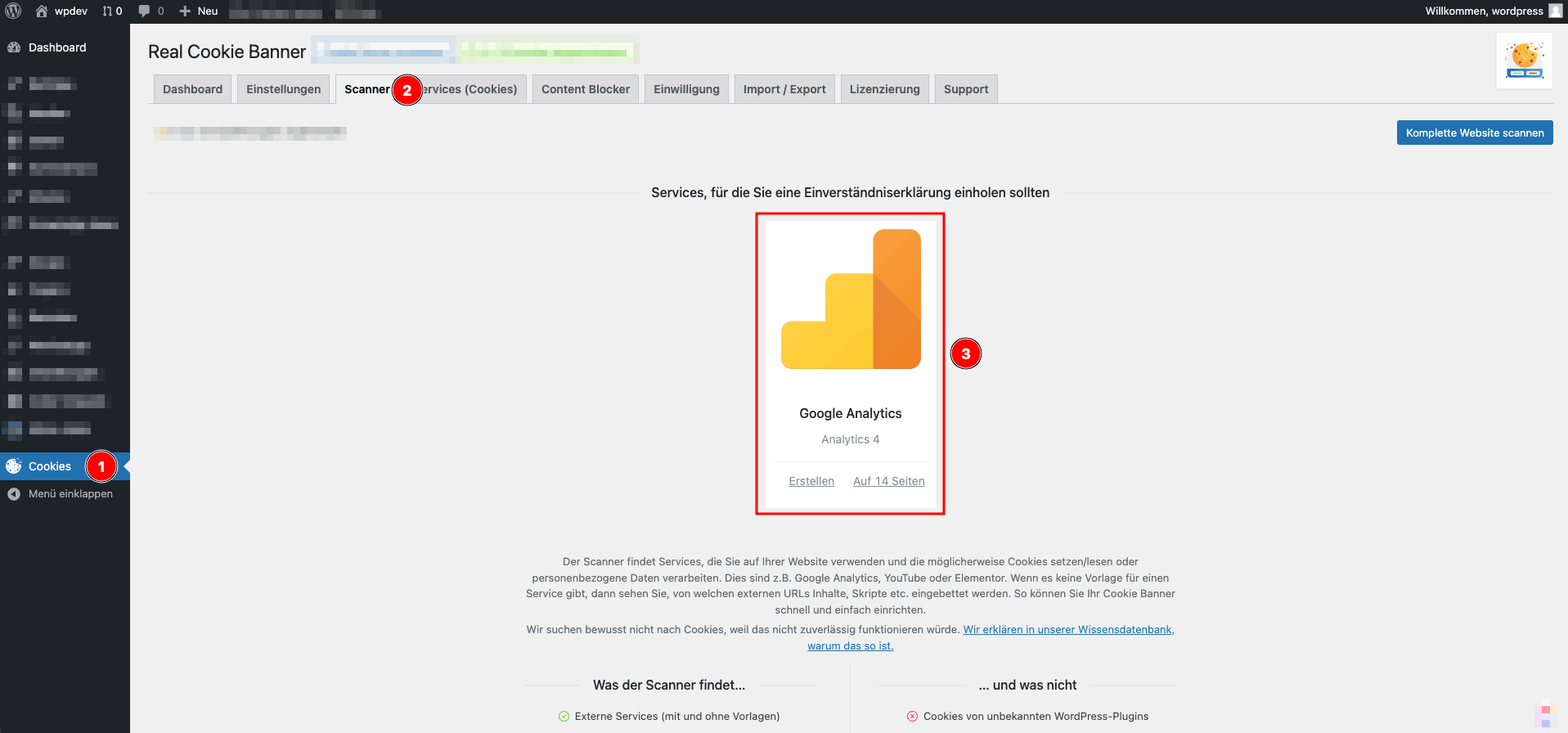 Wenn du Real Cookie Banner installiert und Google Analytics bereits auf deiner Website integriert hast, findet unser Scanner den Service automatisch und zeigt dir die entsprechende Service-Vorlage an.