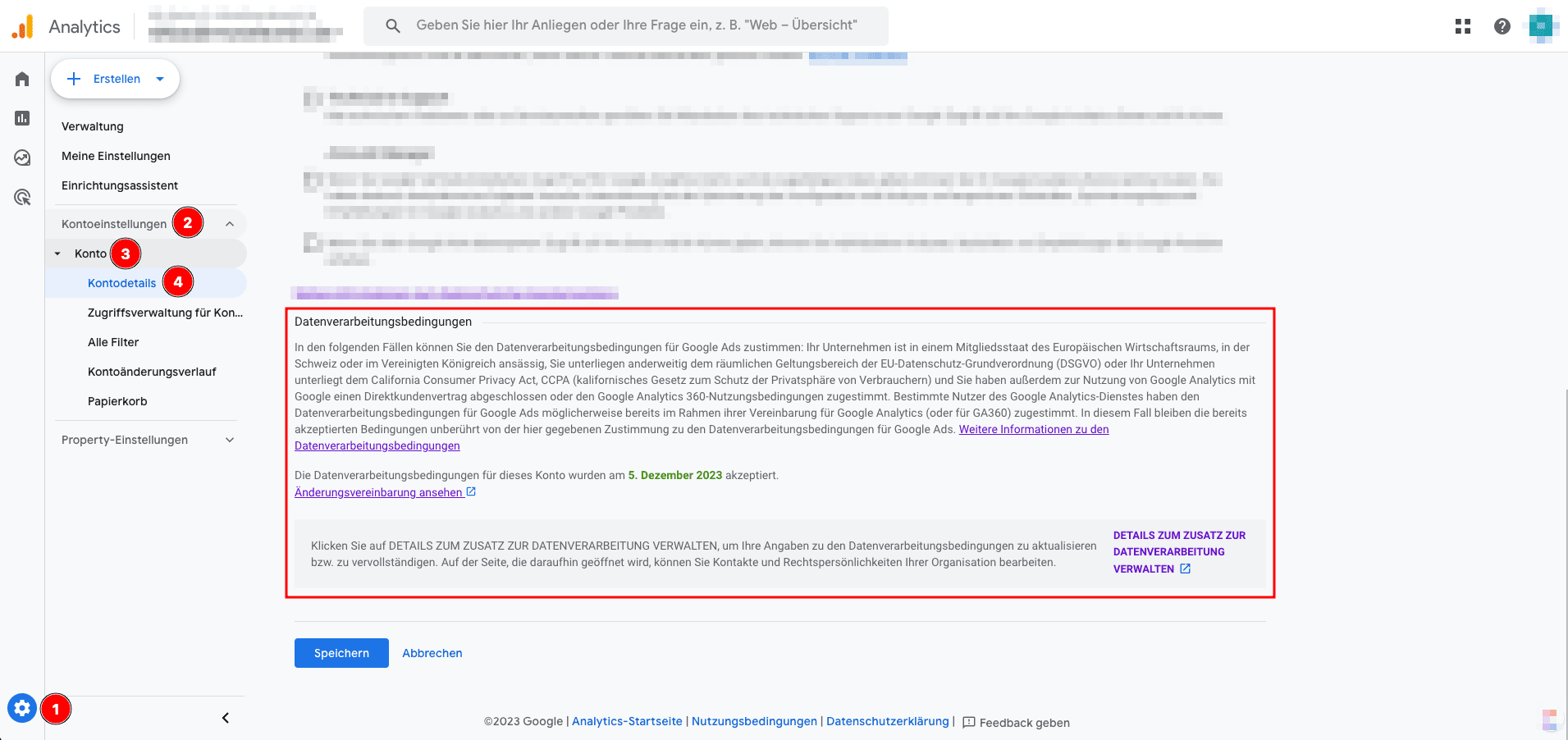 Du findest den Auftragverarbeitungsvertrag in deinem Google Analytics-Konto mit einem Verweis auf das Datum, an dem du der Vereinbarung zugestimmt hast, unter Admin (Zahnrad) > Kontoeinstellungen > Konto > Kontodetails > Datenfreigabeeinstellungen.