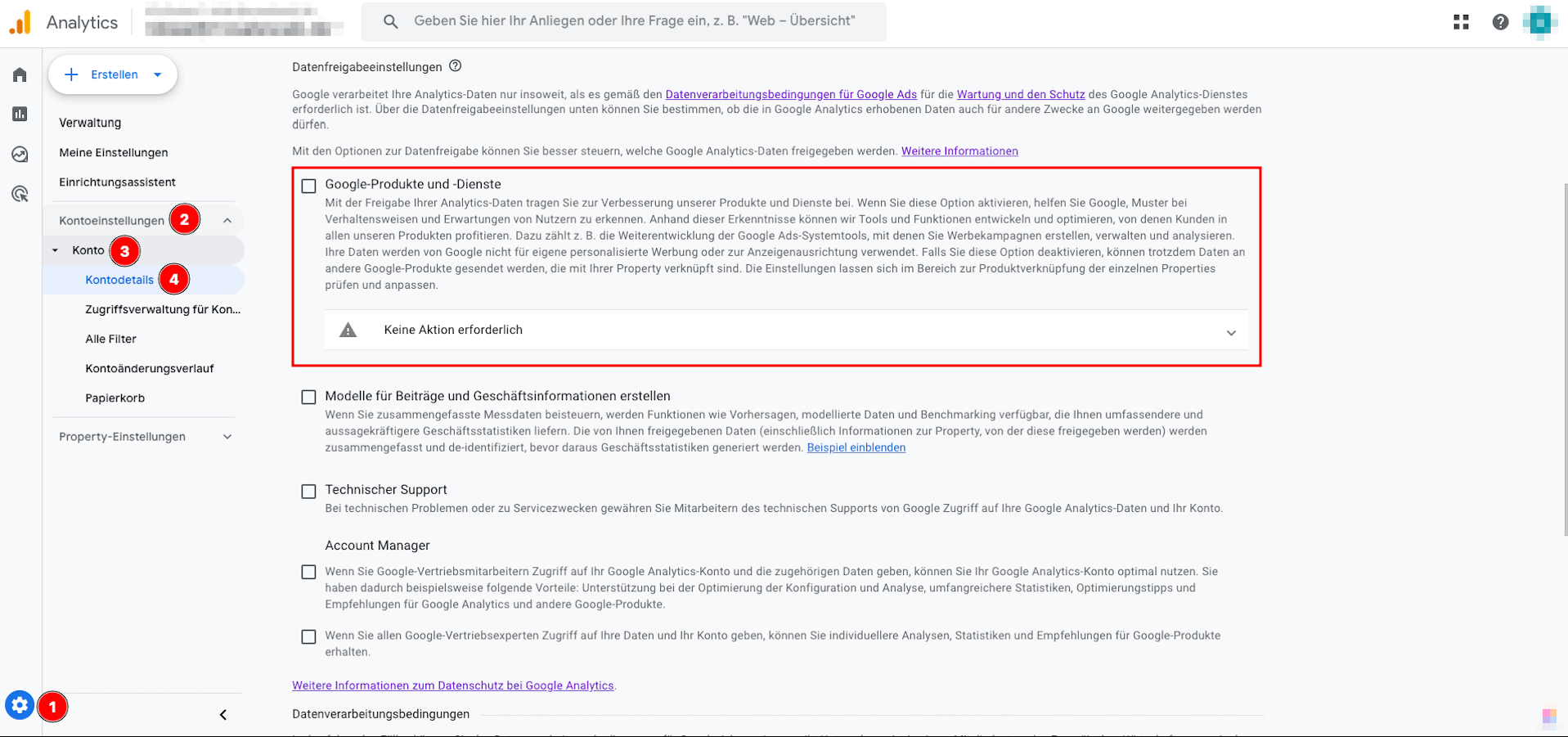 📍Verwaltung (Zahnrad) > Kontoeinstellungen > Konto > Kontodetails > Datenfreigabeeinstellungen > Google-Produkte und -Dienste