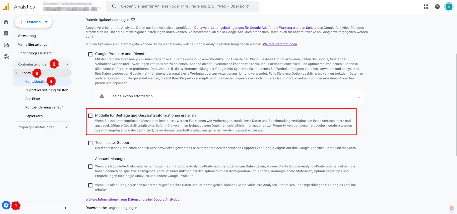 Wir empfehlen dir, diesen voreingestellten Haken zu entfernen, es sei denn, dass du die von Google damit aktivierten “Prognosen, modellierte Daten und Benchmarking” tatsächlich verwendest und sie dir umfassendere und aussagekräftigere Geschäftsstatistiken liefern. Falls du nicht weißt, was diese Einstellung wirklich für einen Nutzen bringt, spricht das sehr stark dafür, dass sie keinen Zweck erfüllt, der eine Datenverarbeitung rechtfertigt.