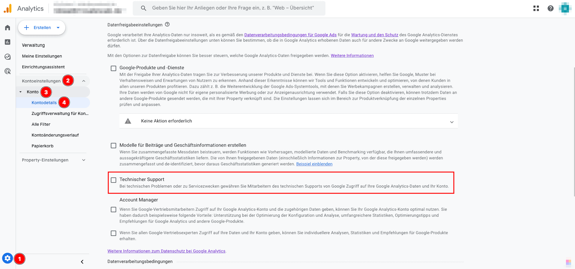 📍Verwaltung (Zahnrad) > Kontoeinstellungen > Konto > Kontodetails > Datenfreigabeeinstellungen > Technischer Support