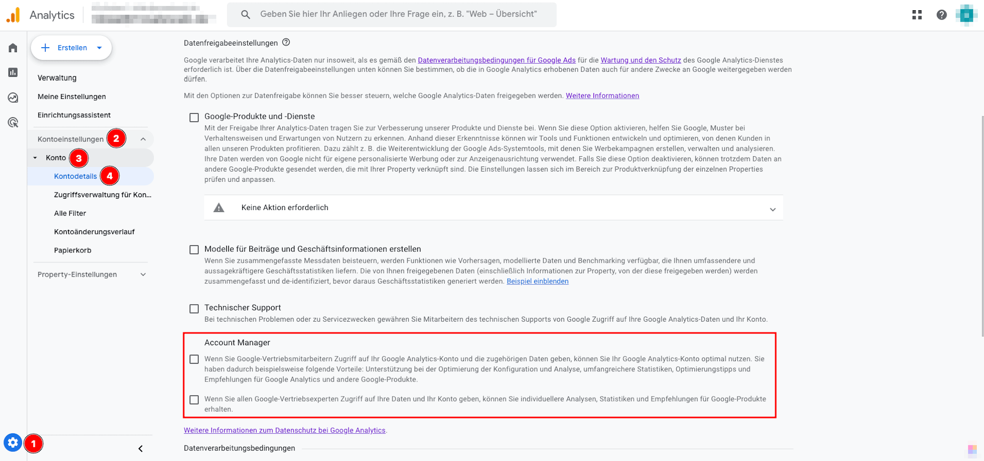 📍Verwaltung (Zahnrad) > Kontoeinstellungen > Konto > Kontodetails > Datenfreigabeeinstellungen > Account Manager