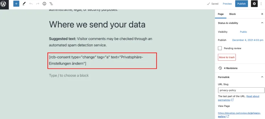 Rechtliche Shortcodes in der Datenschutzerklärung platzieren