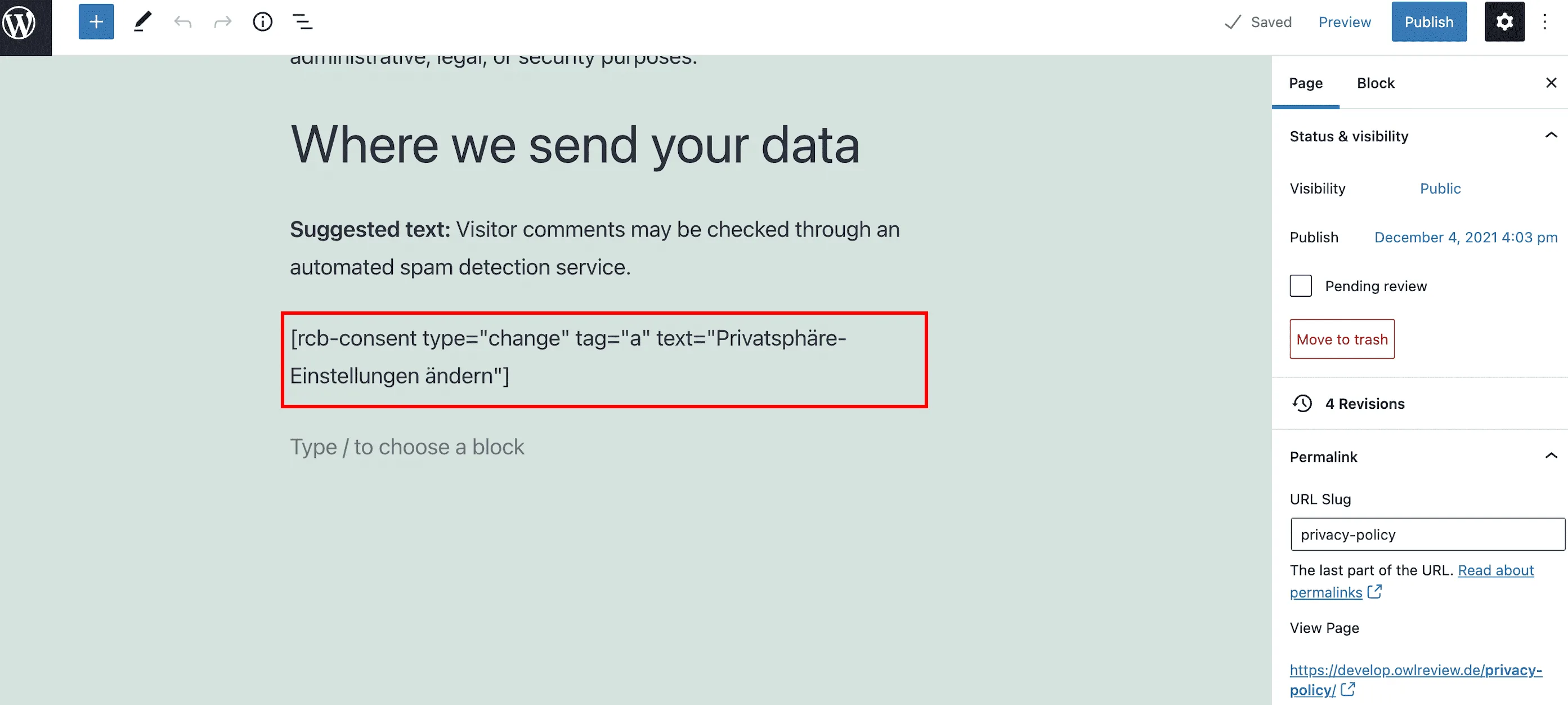 Rechtliche Shortcodes in der Datenschutzerklärung platzieren