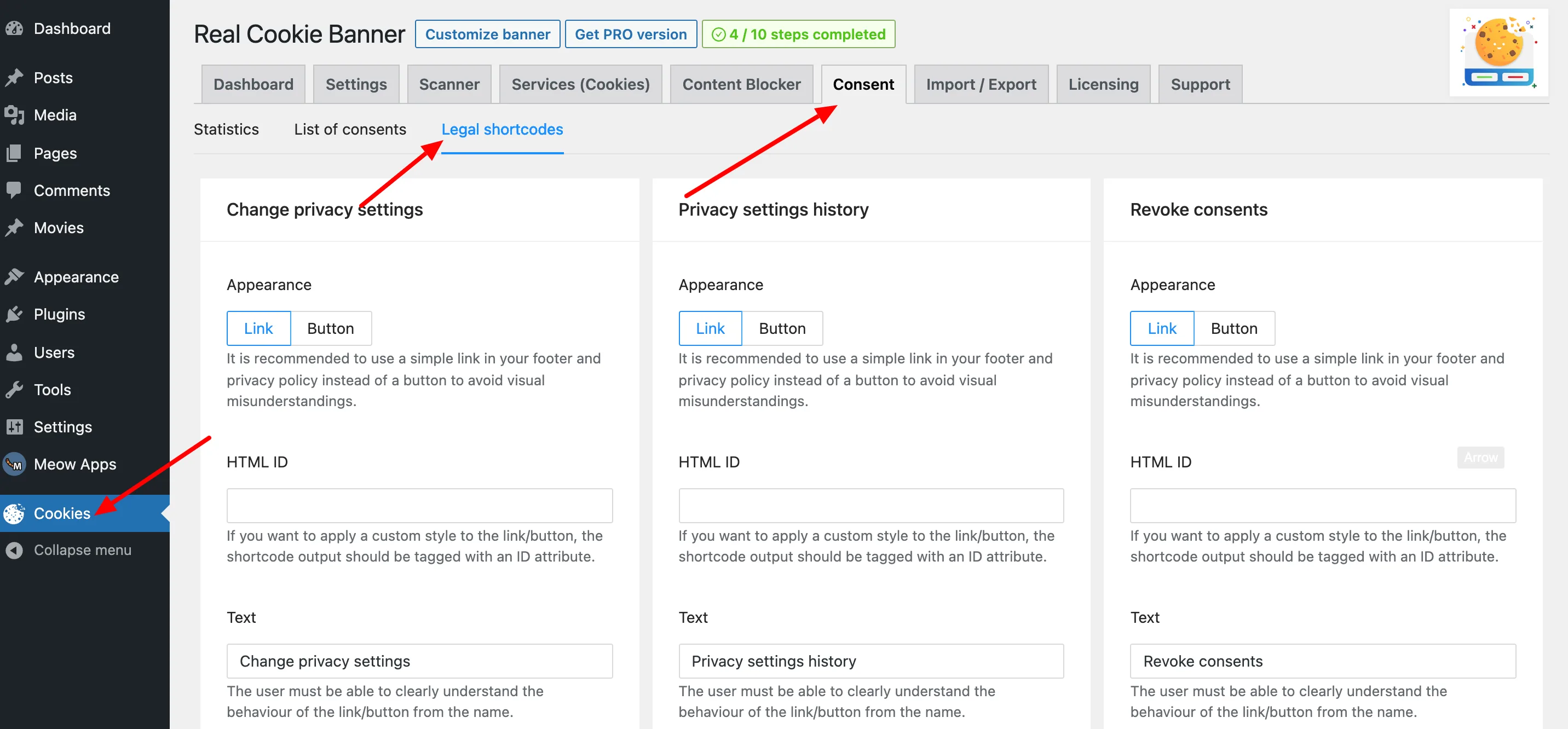 - Hier findest du die drei Spalten Privatsphäre-Einstellungen ändern, Historie der Privatsphäre-Einstellungen und Einwilligungen widerrufen. Für alle drei Funktionen generiert Real Cookie Banner Shortcodes, die du in deine Website einbinden solltest. Optional kannst du diese noch bearbeiten (Link oder Button, angezeigter Text, etc.).
