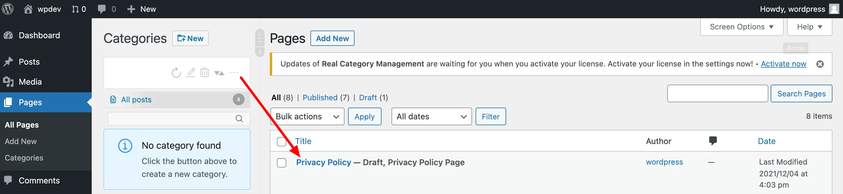- Wähle nun im linken Menü Seiten > Alle Seiten aus und bearbeite die Seite, auf der die Funktionalitäten deinen Besucher bereitgestellt werden sollen. In unserem Fall heißt die Seite Privacy Policy (Englisch für Datenschutzerklärung).