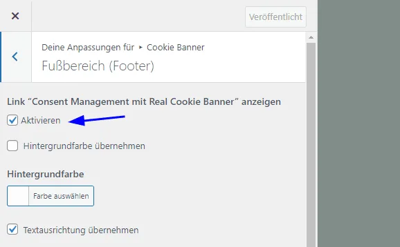 Gehe im Customizer zum Abschnitt "Fußbereich (Footer)" und entferne das Häkchen bei Link “Consent Management mit Real Cookie Banner” anzeigen.