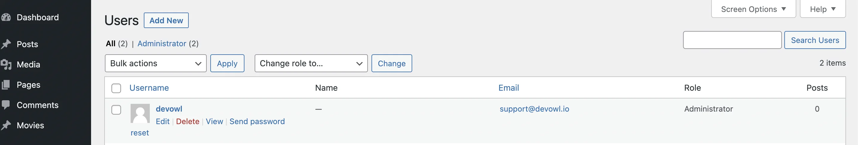 - Fahre mit der Maus über den Namen des Benutzers, den du löschen möchtest. WordPress zeigt dir jetzt automatisch die Option an, auf Löschen zu klicken.