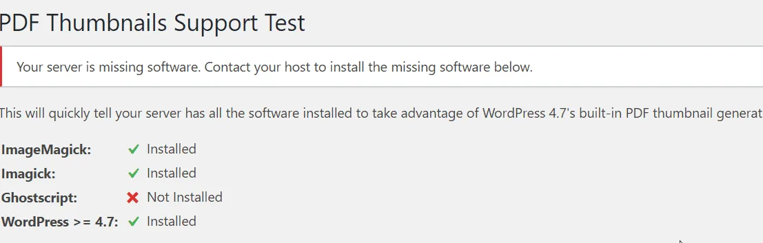 Um Thumbnails von PDFs zu erzeugen, benötigt WordPress ImageMagicl, Imagick PECL Extension und/oder GhostScript als Erweiterung deines PHP. Wenn nach dem Hochladen keine Thumbnails für PDFs erzeugt werden, ist höchstwahrscheinlich eine dieser Komponenten nicht installiert. In den folgenden Schritten kannst du überprüfen, welche der Komponenten fehlt: