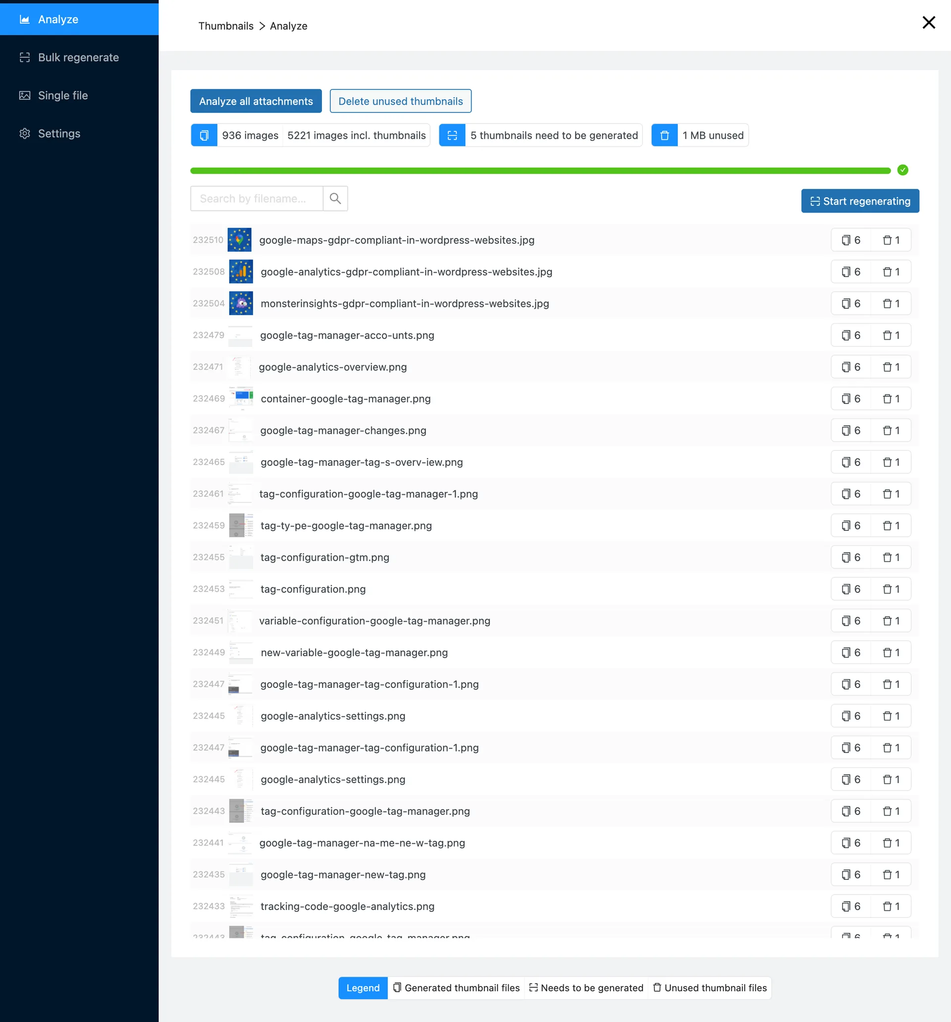 Das Plugin scannt deine Website auf verwendete Dateien. Du kannst anschließend beispielsweise einzelne Bilder neu generieren oder ganze die gesamte Mediathek. Zudem kannst du auswählen, welche Bildgrößen regeneriert und welche ungenutzten Dateien gelöscht werden sollen. Das hilft dir dabei, deine Website von unnötigem Ballast zu befreien, um deinen Webspace clean zu halten.
