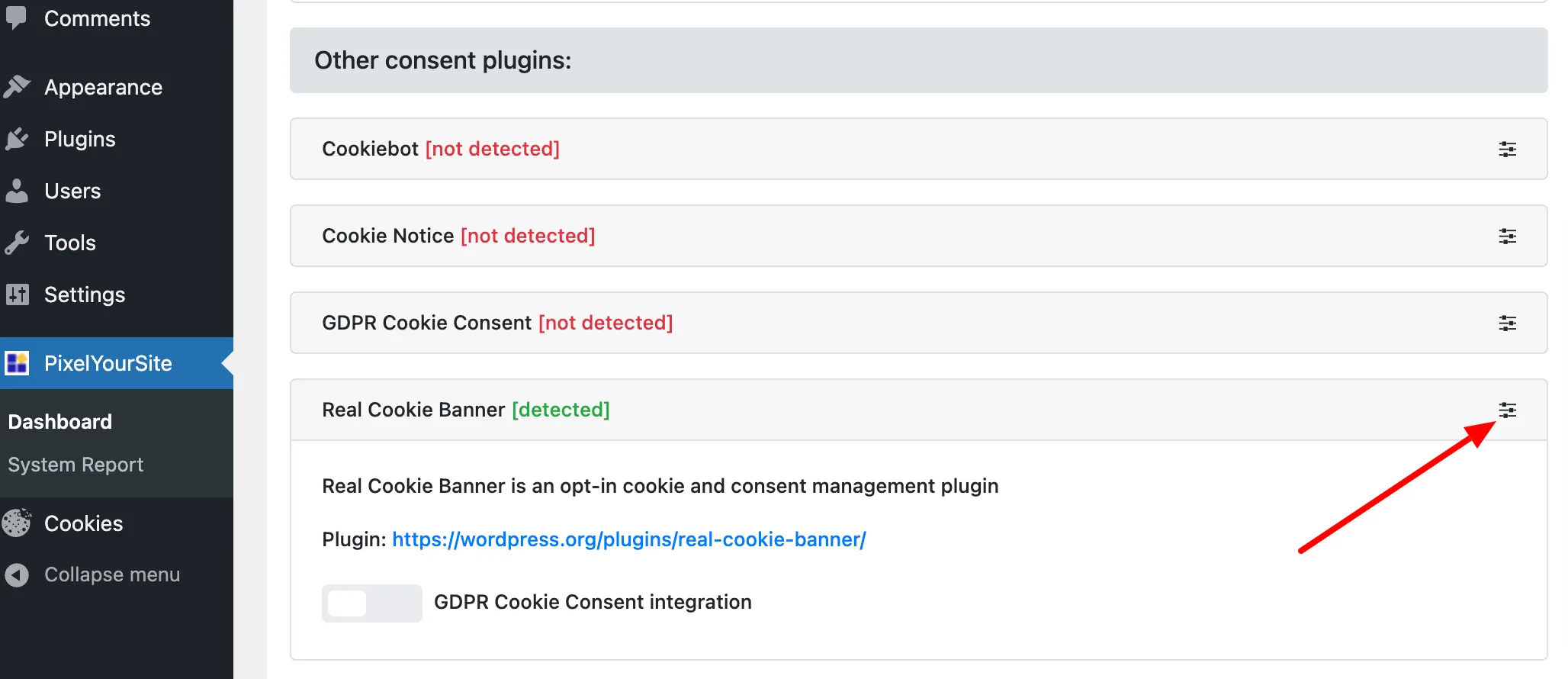 - Here you have the option to activate the Real Cookie Banner integration by activating the button next to GDPR Cookie Consent integration. Now you have activated the Real Cookie Banner integration in PixelYourSite. In order to use the pixels in such a way that they meet the requirements of the GDPR and ePrivacy Directive, one final step is still missing: the creation of the pixel in Real Cookie Banner so that informed consent is obtained from your website visitors.