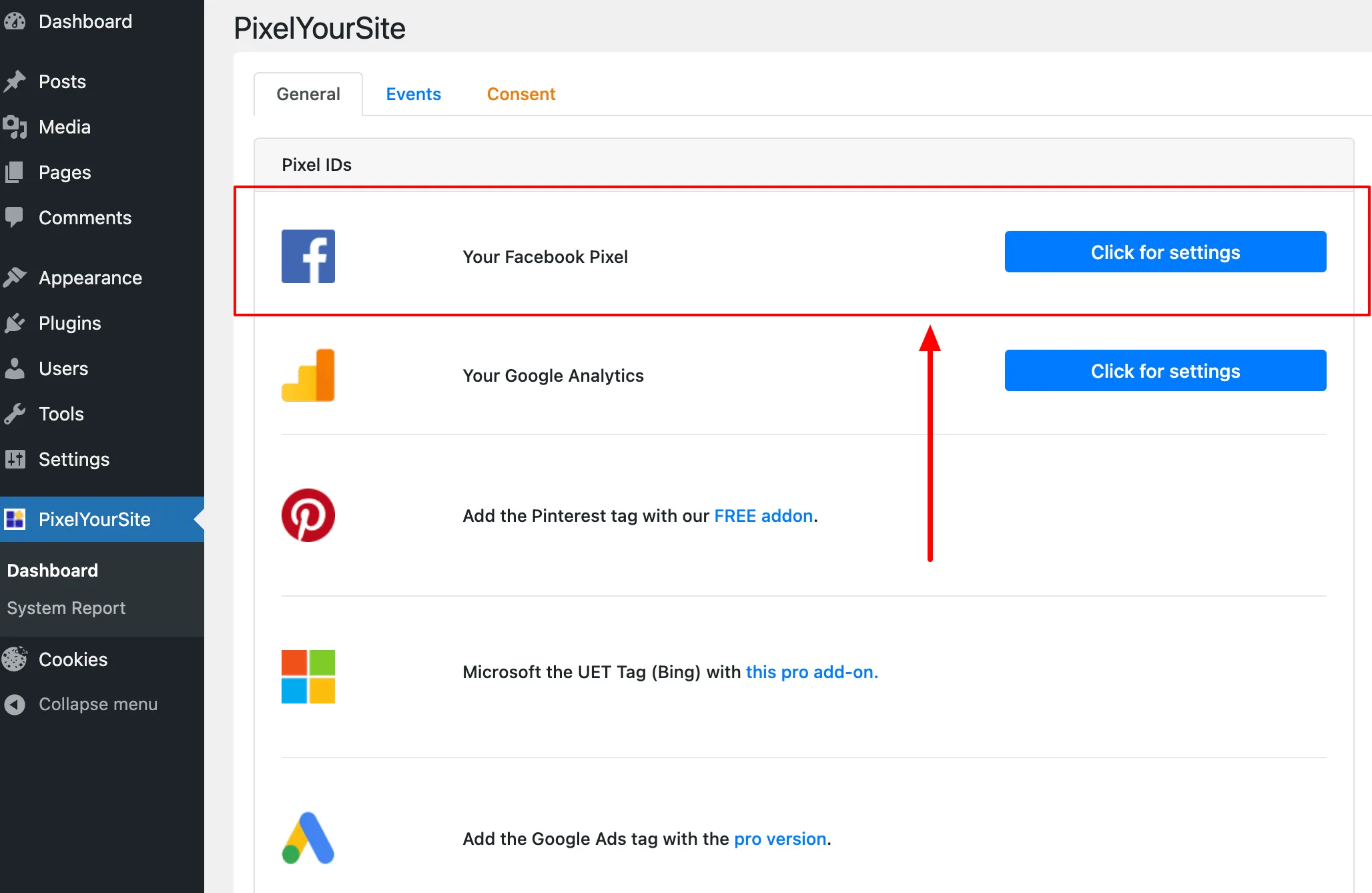 - Then go to the WordPress backend and click on PixelYourSite in the left menu bar.