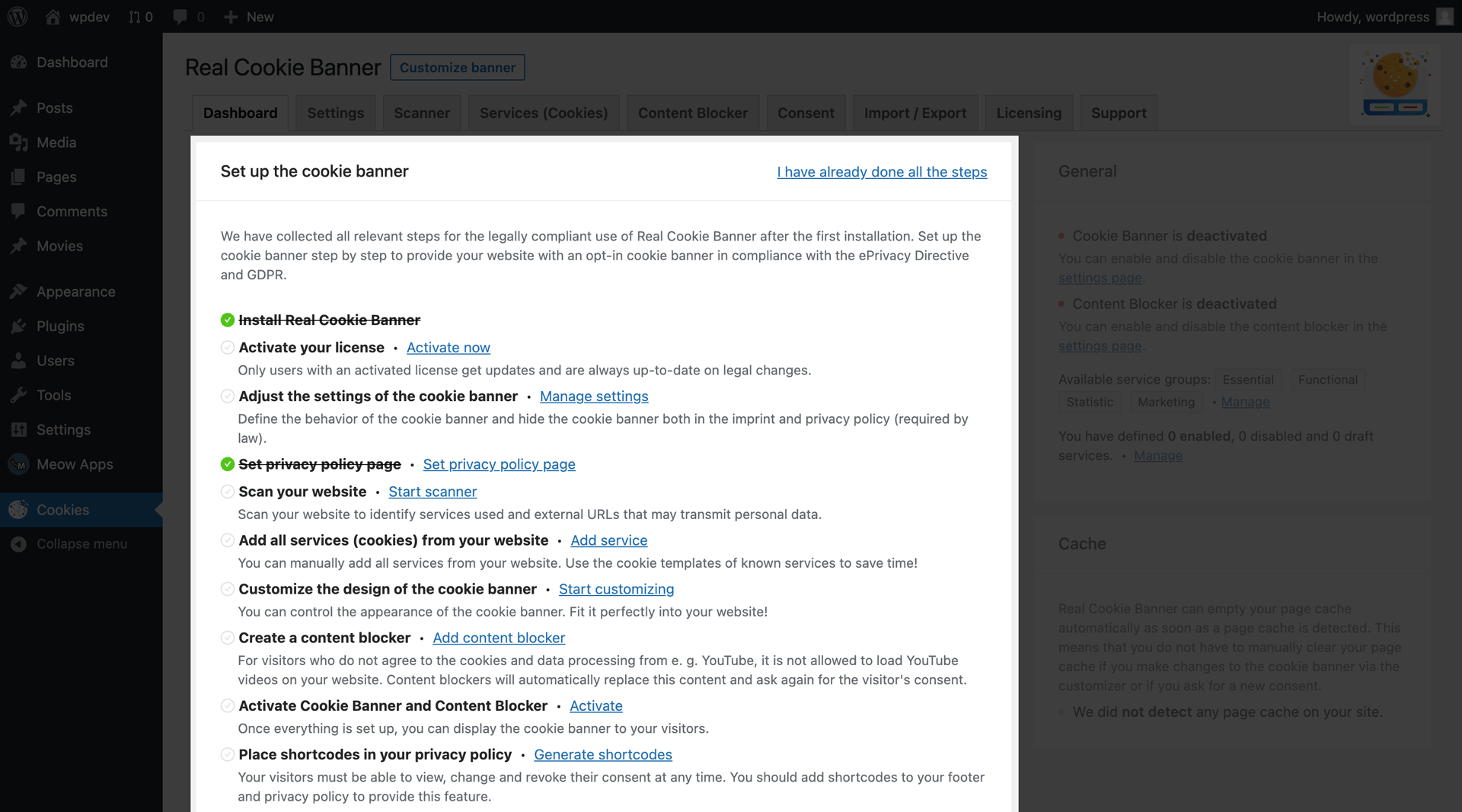 In case you want to try it once again by yourself, we would like to point you to our guided configuration. As you can see in the following screenshot, you will find a checklist in the dashboard of the Real Cookie Banner settings. It will guide you step by step through all the necessary tasks you need to complete to set up the cookie banner. You can return to the dashboard at any time during the setup process to see what tasks still need to be completed.