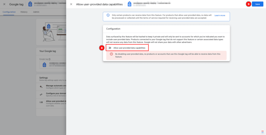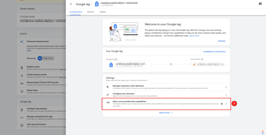 📍Admin (gearwheel) > Property Settings > Data collections and modifications > Data streams > Web stream details [name of stream] > Google tag > Configure tag settings > [Show more] > Allow user-provided data capabilities