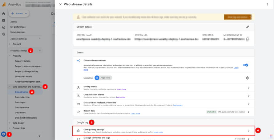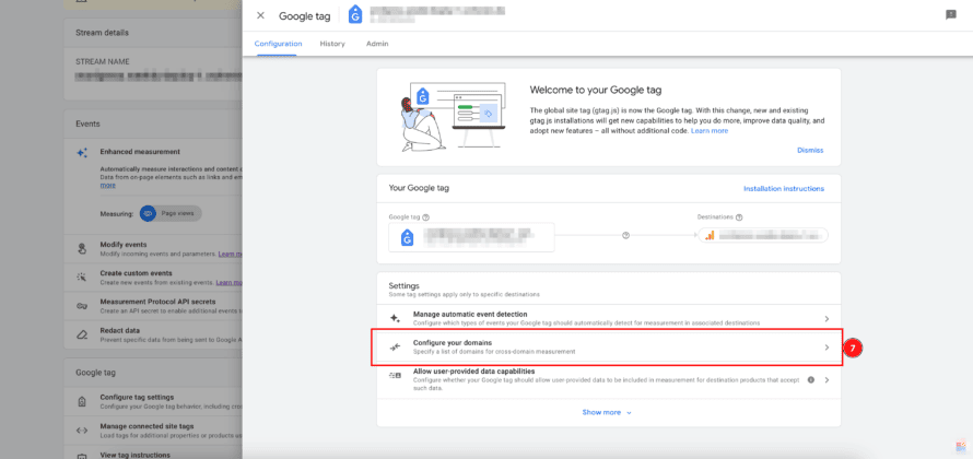 📍Admin (gearwheel) > Property Settings > Data collections and modifications > Data streams > Web stream details [name of stream] > Google tag > Configure tag settings > Configure your domains > Cross-domain Linking Configuration