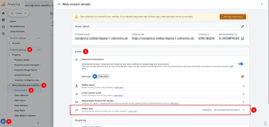 📍Admin (gearwheel) > Property Settings > Data collections and modifications > Data streams > Web stream details [name of stream] > Events > Redact data