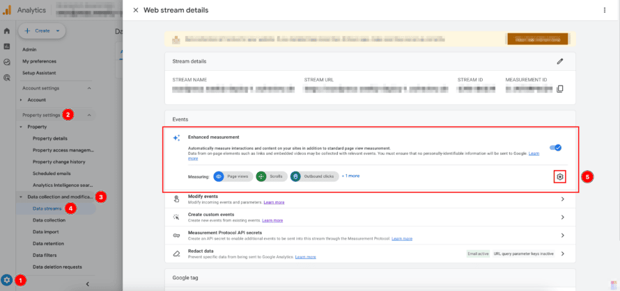 📍Admin (gearwheel) > Property Settings > Data collections and modifications > Data streams > Web stream details [name of stream] > Events > Enhanced measurement > [all options]