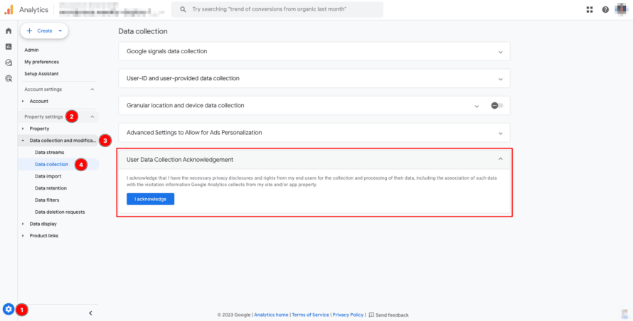 📍Admin (gearwheel) > Property Settings > Data collections and modifications > Data collection > User Data Collection Acknowledgement