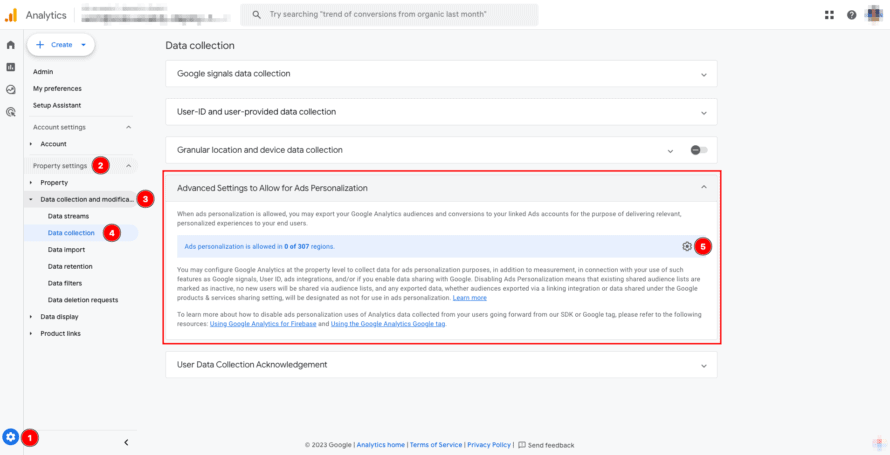 📍Admin (gearwheel) > Property Settings > Data collections and modifications > Data collection > Advanced Settings to Allow for Ads Personalization