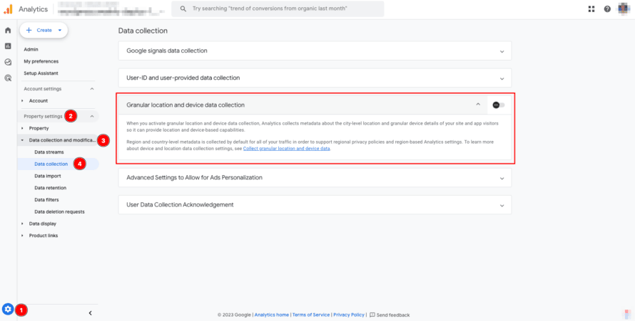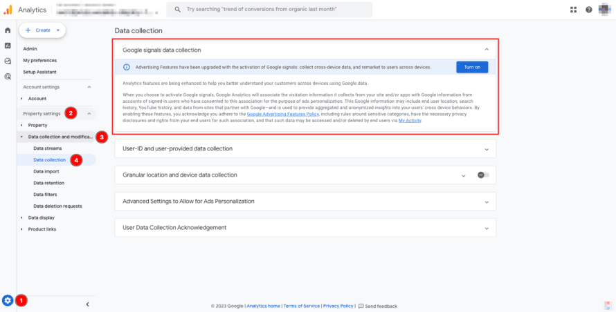📍Admin (gearwheel) > Property Settings > Data collections and modifications > Data collection > Google Signals data collection