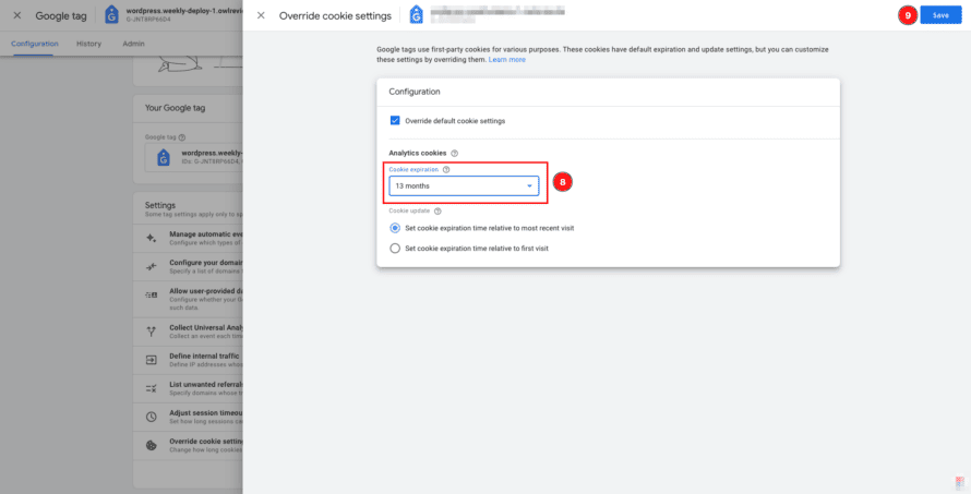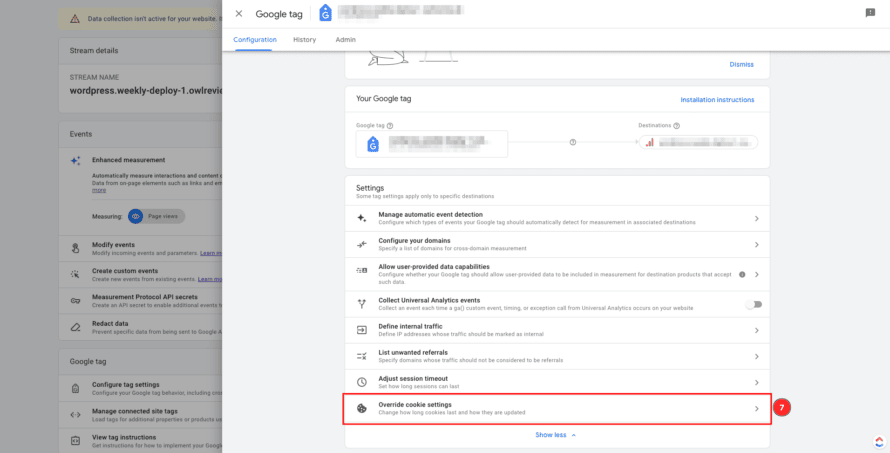 📍Admin (gearwheel) > Property Settings > Data collections and modifications > Data streams > Web stream details [name of stream] > Google tag > Configure tag settings > [Show more] > Override cookie settings